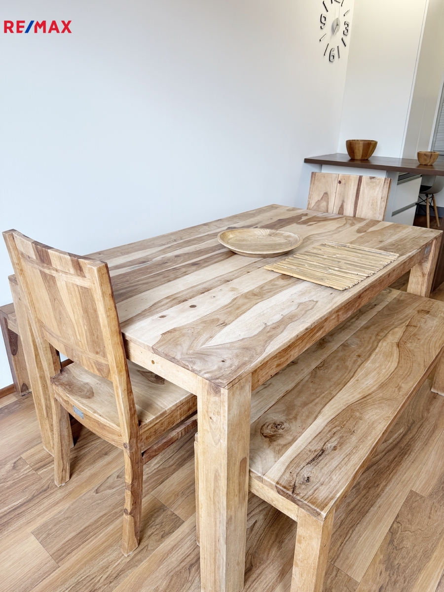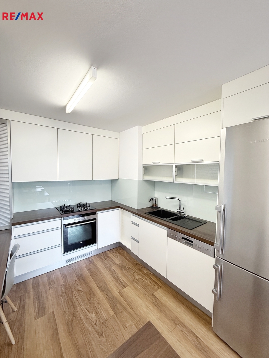 Moderní kuchyň je plně vybavená všemi spotřebiči včetně myčky, trouby, varné desky a lednice. Součástí kuchyně je i praktický pracovní kout u okna.