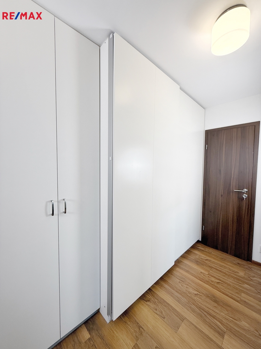 Byt disponuje prostornou šatnou a vestavěnými skříněmi, které nabídnou dostatek úložného prostoru.