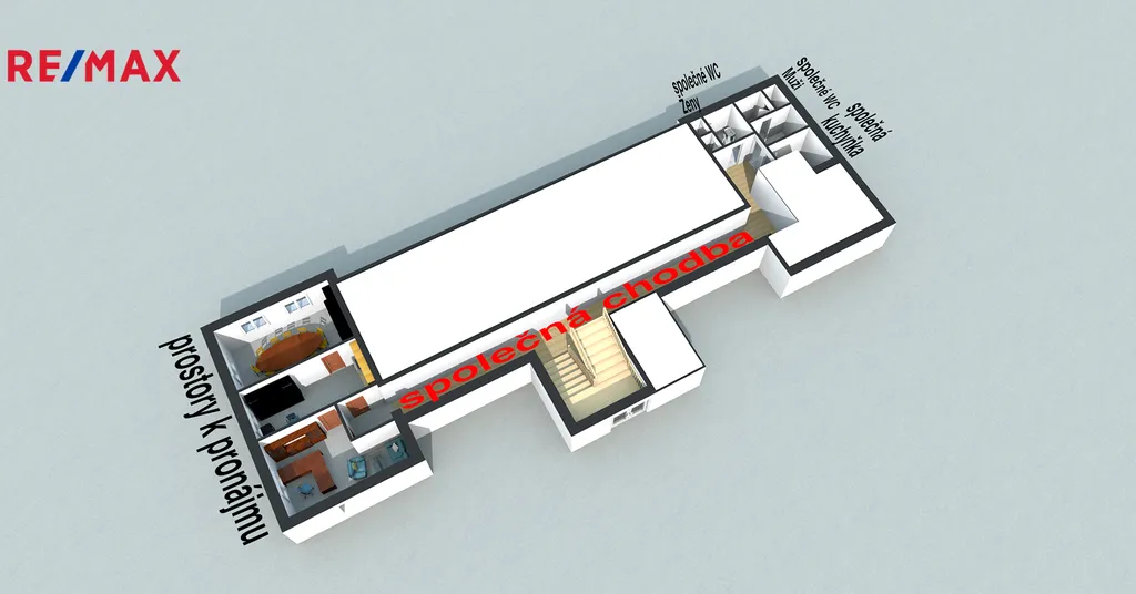 K nabízenému prostoru je možné využívat i společné sociální zázemí v druhé části 1.NP budovy, které se skládá z oddělených toalet s umyvadly pro ženy (2x toaleta) a muže (1x toaleta a 2x pisoár) a společné kuchyňky.