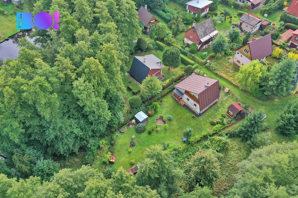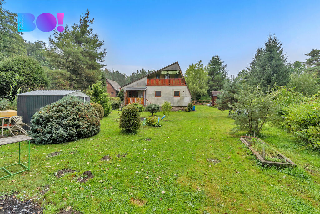 K chatě náleží pozemek o rozloze 572 m² s venkovní pergolou, ideální pro zahrádkaření a relaxaci.