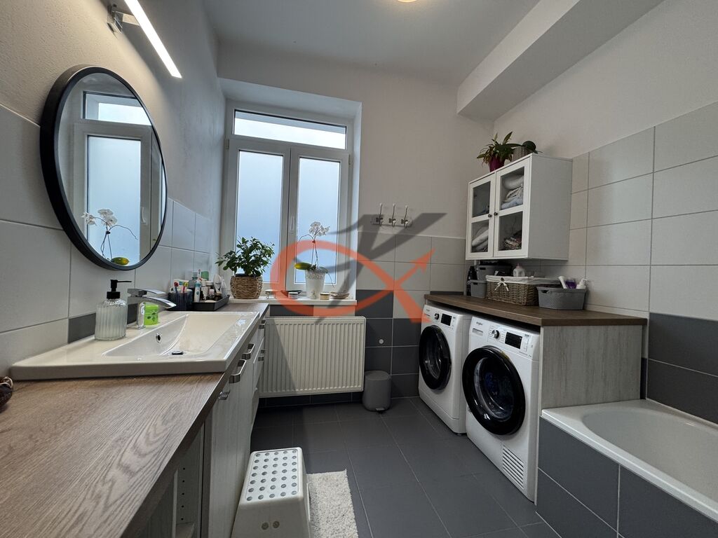 Koupelna s vanou je prostorná a oddělené WC přispívá k pohodlí celé rodiny. Všechny pokoje jsou neprůchozí, což zaručuje soukromí – ideální uspořádání pro ložnici, dětský pokoj a obývací pokoj. Vysoké stropy a dostatek denního světla vytvářejí příjemnou, vzdušnou atmosféru.