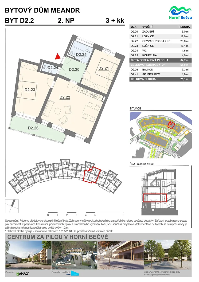 Nabízíme ke koupi moderní byt 3+kk o podlahové ploše 75 m² v připravovaném developerském projektu v malebné obci Horní Bečva. Byt se nachází v nízkopodlažním bytovém domě, situovaném v klidné lokalitě s krásnými výhledy na okolní beskydskou krajinu.