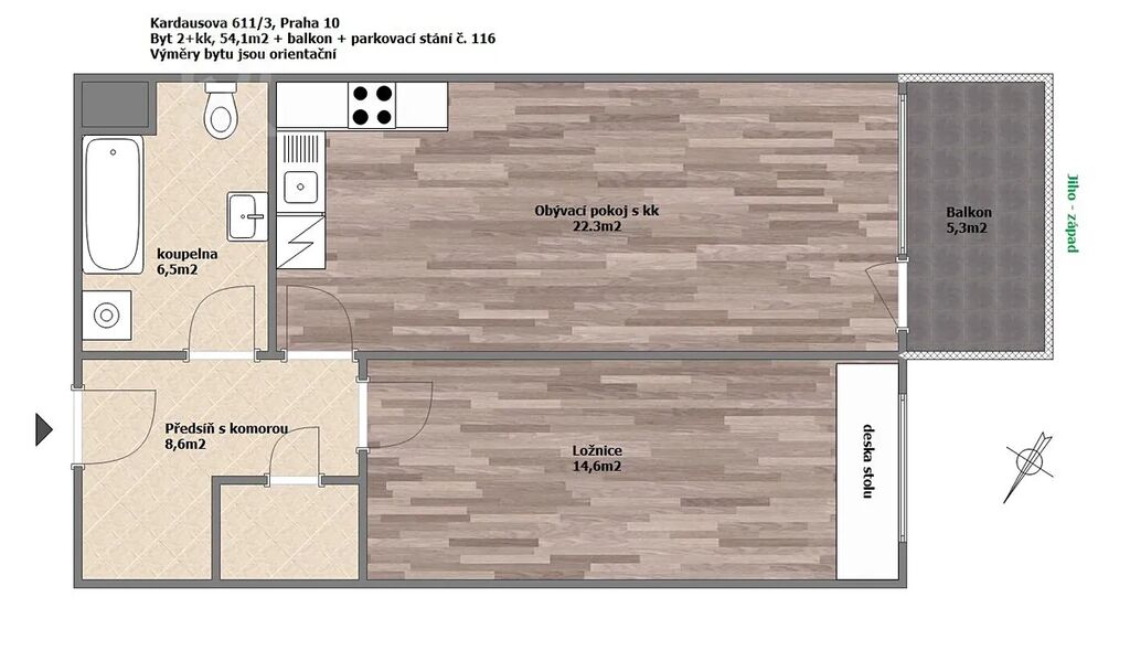 Byt s dispozicí 2+kk o ploše 54,5 m2 se nachází ve 5. nadzemním podlaží. Okna i lodžie jsou na jihozápad.