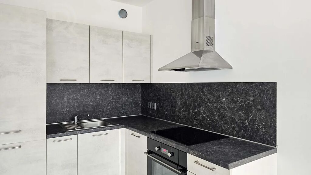 Kuchyňská linka je vybavena vestavnou lednicí, trouba, varnou deska, digestoří a dřezem.