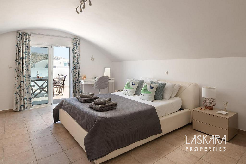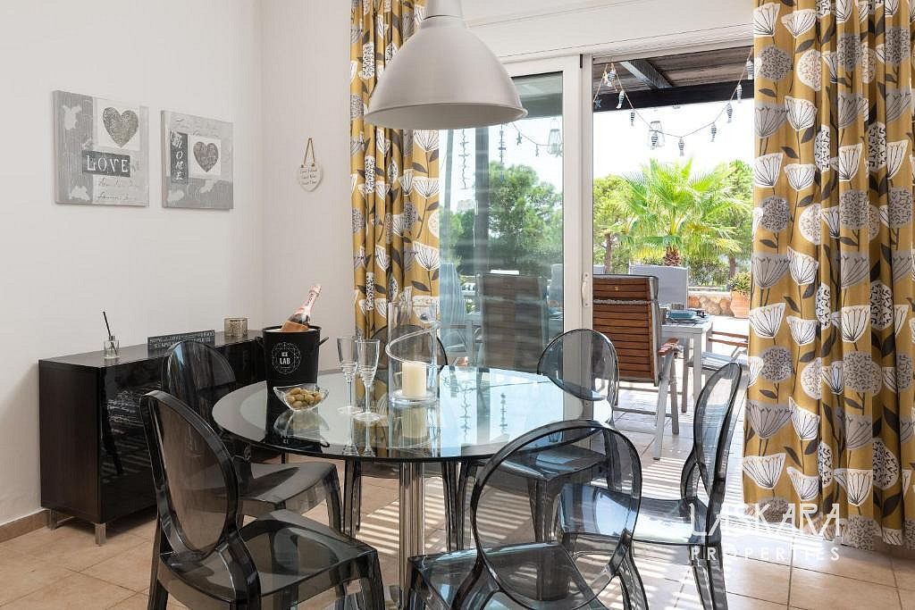 Interiér o rozloze 168 m² působí svěže a přirozeně. V přízemí se nachází otevřený obývací prostor s plně vybavenou kuchyní a jídelnou, zatímco v patře jsou tři komfortní ložnice a dvě koupelny s dvojumyvadly. Z hlavní ložnice vede balkon s výhledem, který připomíná pocit bezčasí – pohled na moře, který se neomrzí.