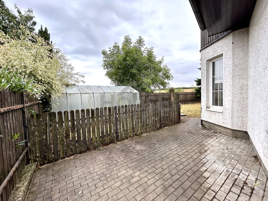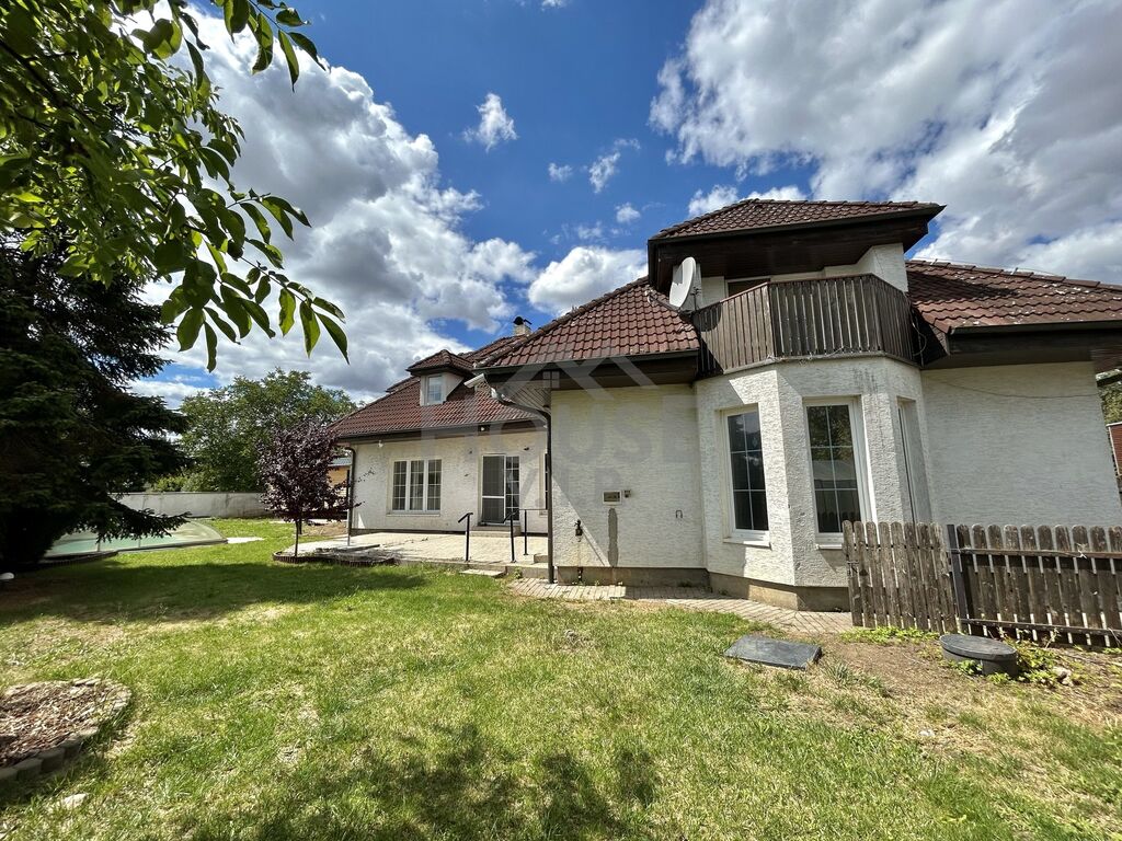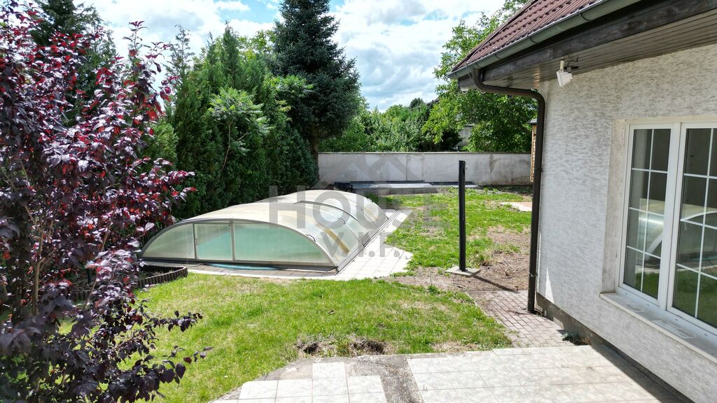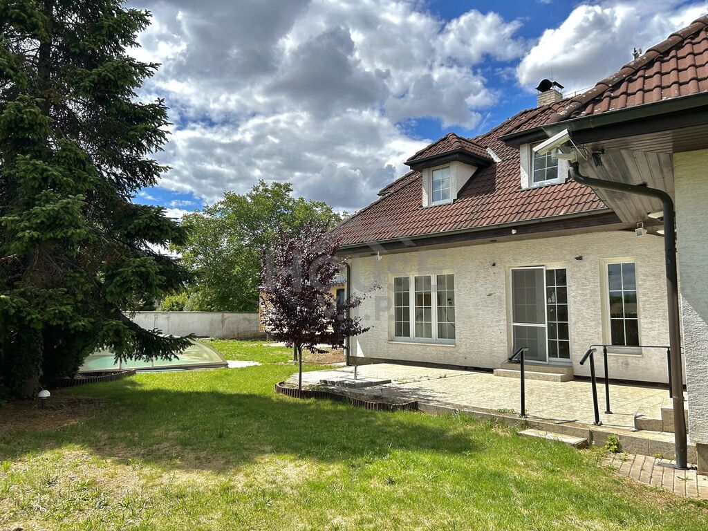 Exteriér a lokalita: Udržovaná zahrada s bazénem a plným soukromím. Parkování na pozemku. Klidná ulice s výhledem na pole – ideální pro rodinné bydlení.