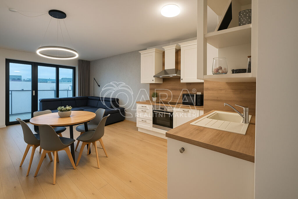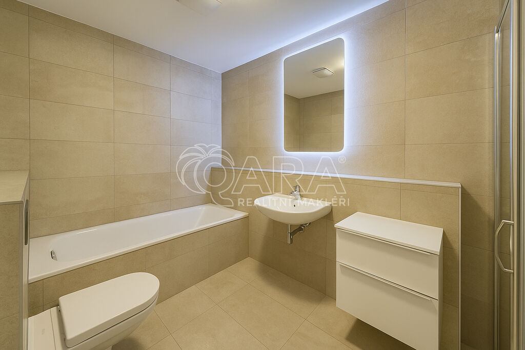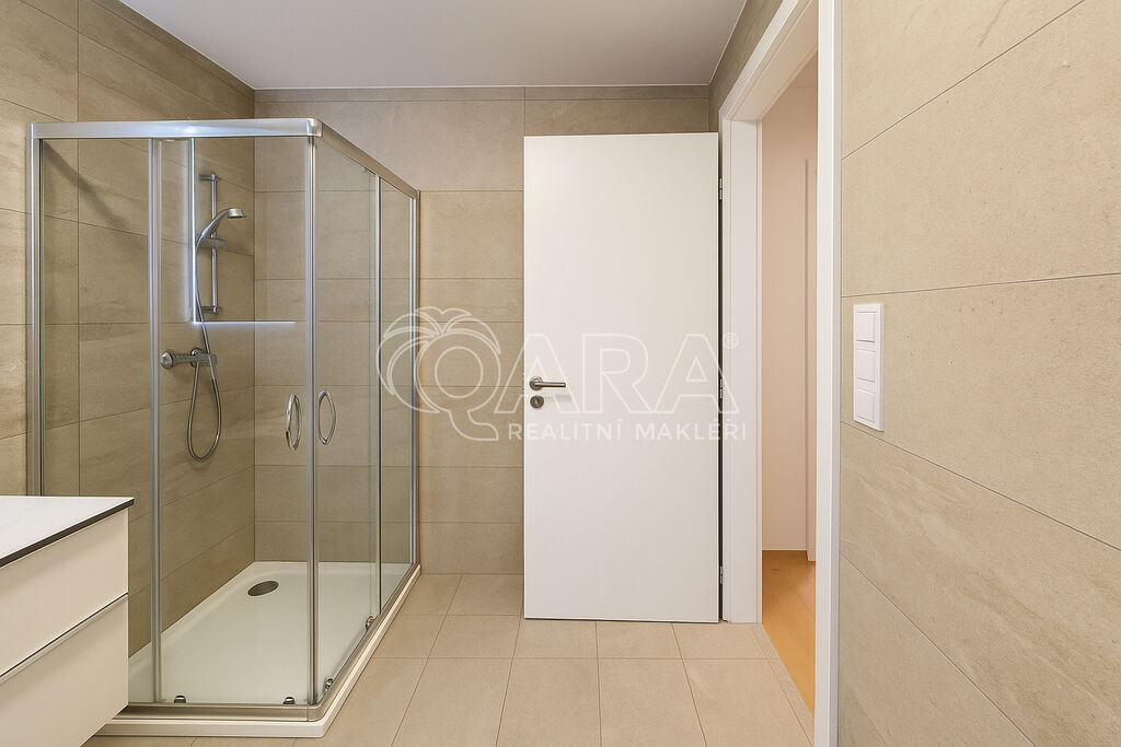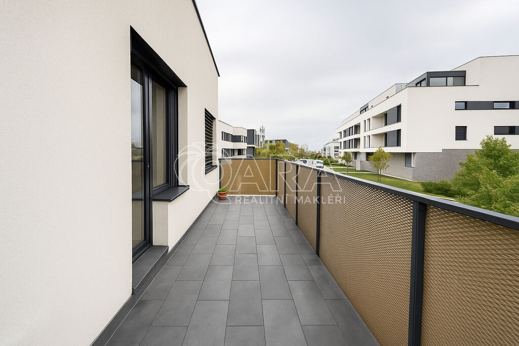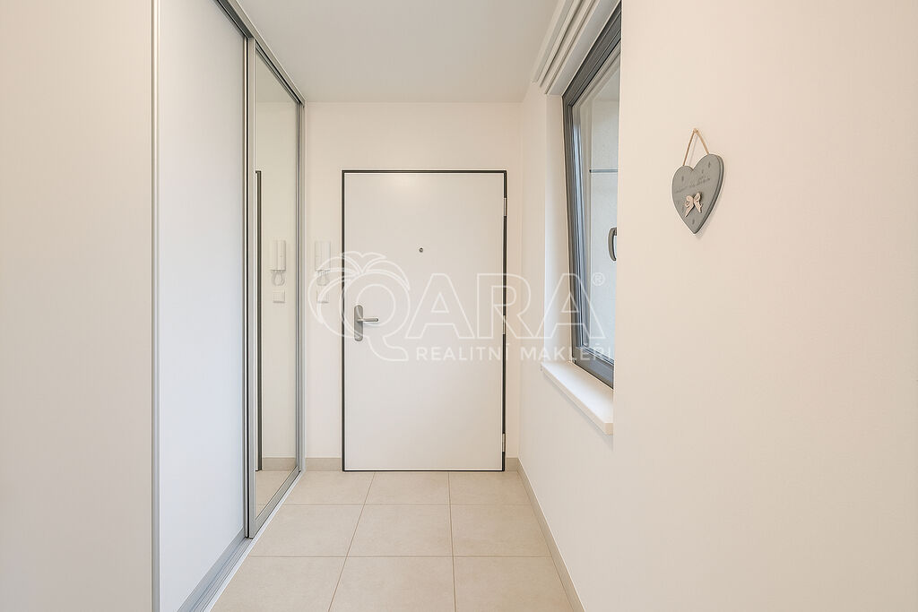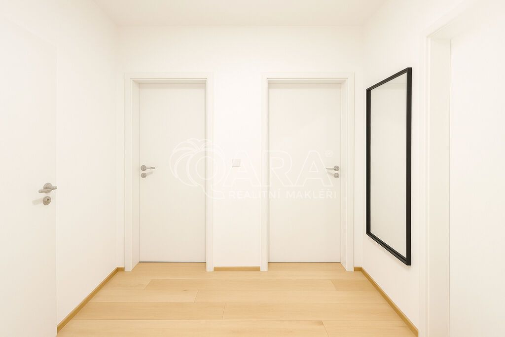 Vstupní chodba nabízí dostatek úložného prostoru díky vestavěným skříním a vstup na samostatné WC. Obývací pokoj s plně vybavenou kuchyňskou linkou (myčka nádobí, indukční deska, digestoř, trouba, lednice, mrazák). Z obývací části je přímý vstup na prostorný balkon, který se rozkládá po obvodu bytu a nabízí výhled do klidné části rezidence. Obývací část lze od zbytku bytu oddělit posuvnými dveřmi, což zajišťuje maximální soukromí. Dvě samostatné ložnice. V jedné z nich další vestavěná skřín. K dispozici je také komora/šatna s pračkou a koupelna s vanou i sprchovým koutem. Druhá toaleta je samozřejmostí. Byt je vybaven předokenními venkovními žaluziemi. Jednotka se nachází v moderní budově s kamerovým systémem, vstupem na čip a výtahem. K bytu náleží garážové stání a sklep.
