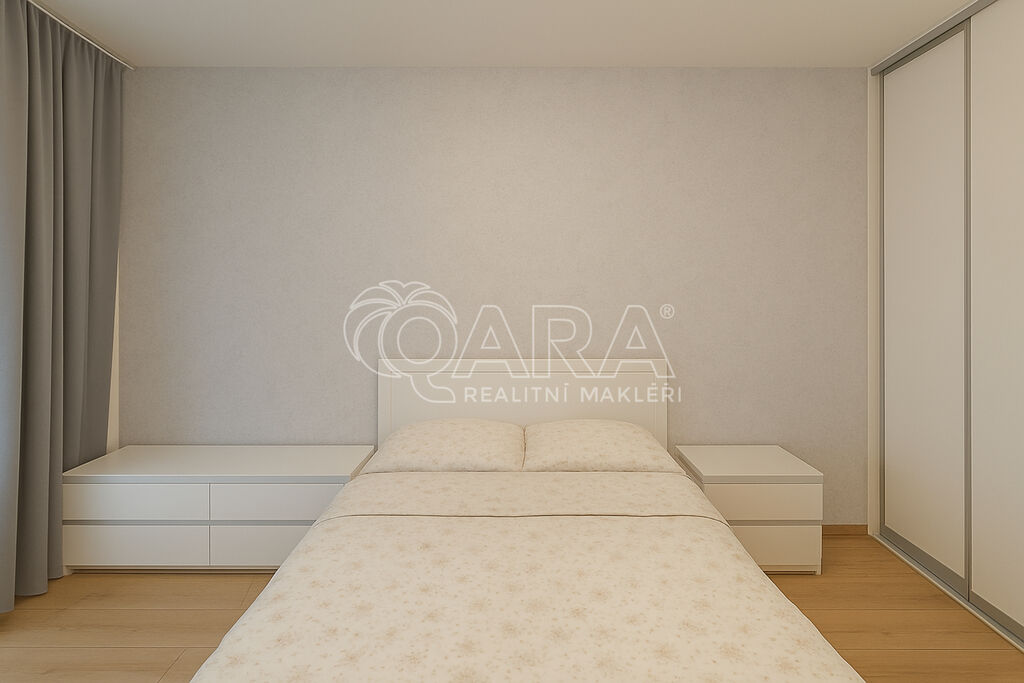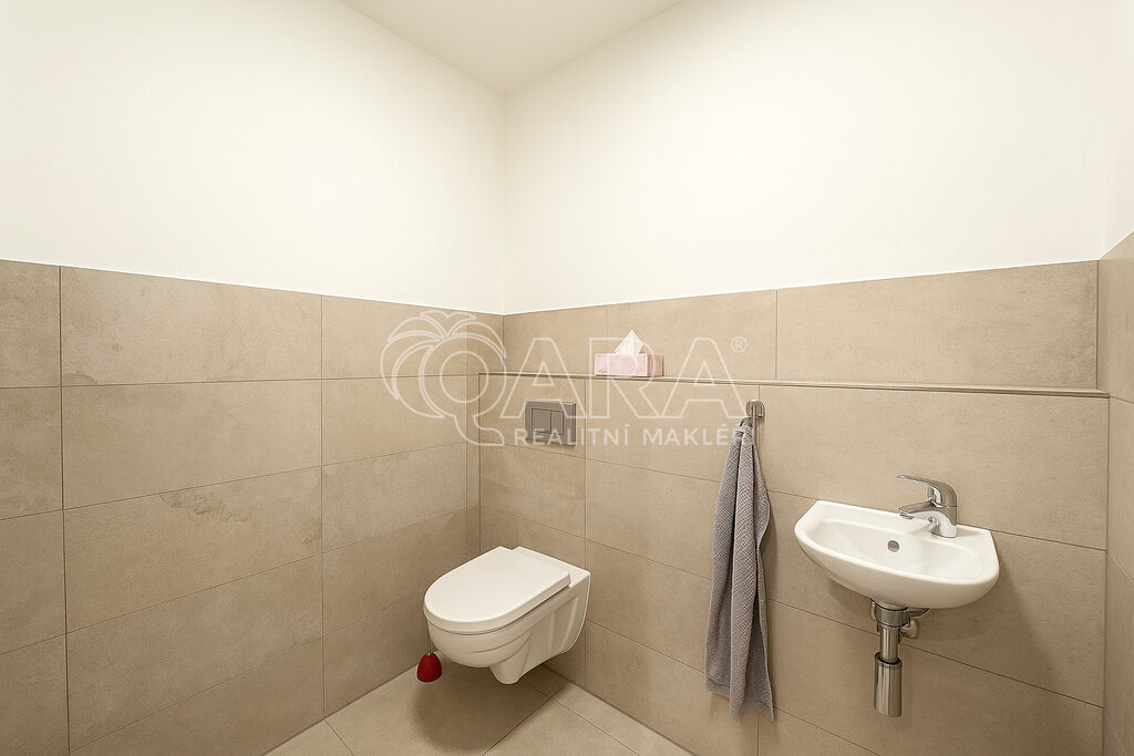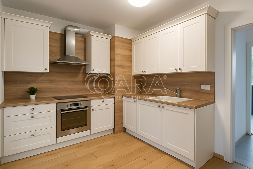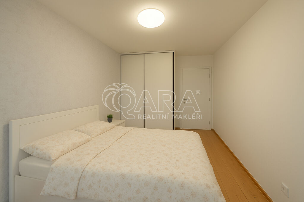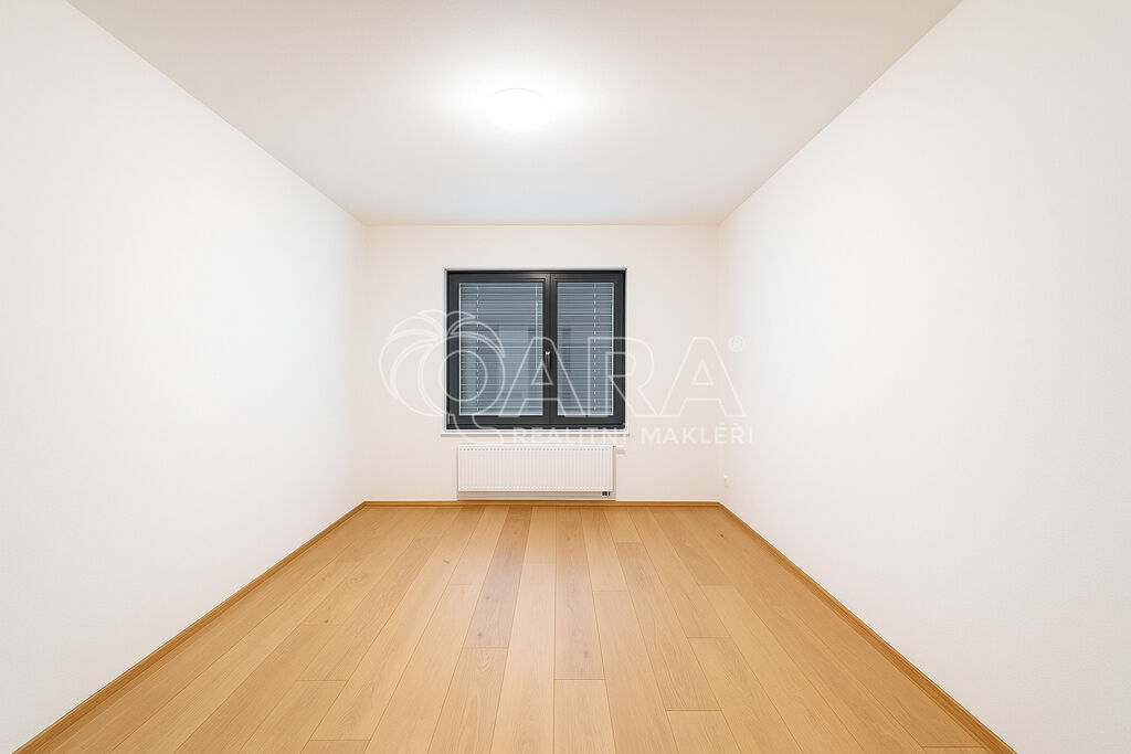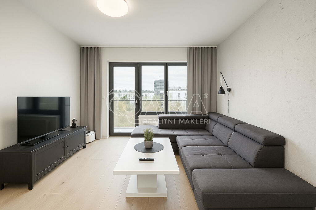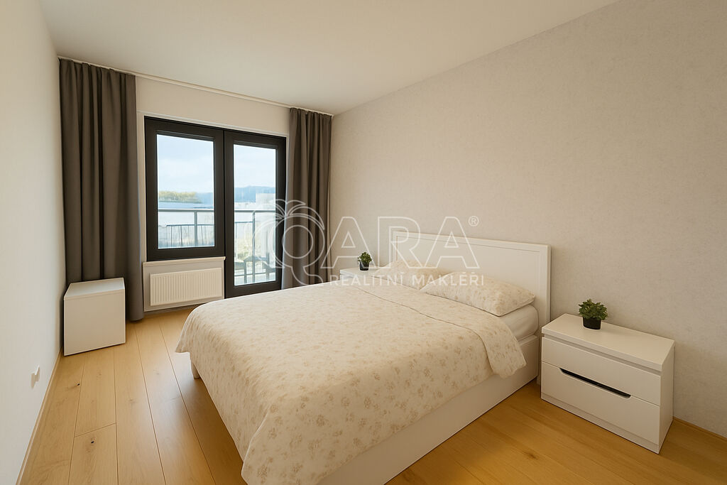 Vstupní chodba nabízí dostatek úložného prostoru díky vestavěným skříním a vstup na samostatné WC. Obývací pokoj s plně vybavenou kuchyňskou linkou (myčka nádobí, indukční deska, digestoř, trouba, lednice, mrazák). Z obývací části je přímý vstup na prostorný balkon, který se rozkládá po obvodu bytu a nabízí výhled do klidné části rezidence. Obývací část lze od zbytku bytu oddělit posuvnými dveřmi, což zajišťuje maximální soukromí. Dvě samostatné ložnice. V jedné z nich další vestavěná skřín. K dispozici je také komora/šatna s pračkou a koupelna s vanou i sprchovým koutem. Druhá toaleta je samozřejmostí. Byt je vybaven předokenními venkovními žaluziemi. Jednotka se nachází v moderní budově s kamerovým systémem, vstupem na čip a výtahem. K bytu náleží garážové stání a sklep.