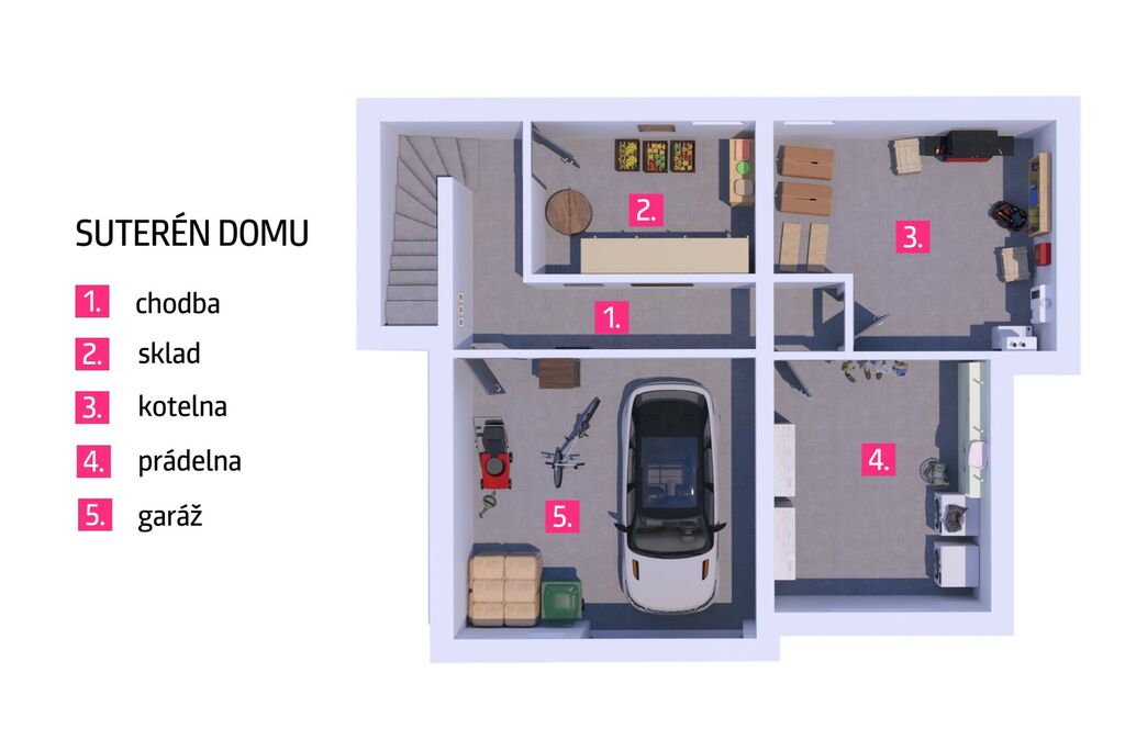 Nemovitost má tři podlaží – přízemí, obytné podkroví a suterén. V přízemí se nachází zádveří, prostorná vstupní chodba, koupelna vybavená vanou i sprchovým koutem, kuchyně a velký obývací pokoj s jídelním koutem. V podkroví jsou umístěny tři samostatné ložnice, toaleta a pracovna. Ta může být dle potřeby jednoduše přebudována na další koupelnu, jelikož jsou zde již připraveny rozvody vody a odpadu. V suterénu se nachází prádelna, skladovací místnost, kotelna a prostorná garáž.