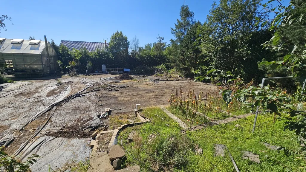 Pozemek je oplocený ze tří stran, se vzrostlou zelení kolem celého pozemku.