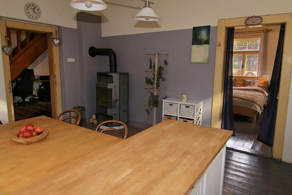 Vytápění rodinného domu zajišťují krbová kamna. Zdrojem vody je primárně vrtaná studna s dostatečnou vydatností pro celoroční užívání.