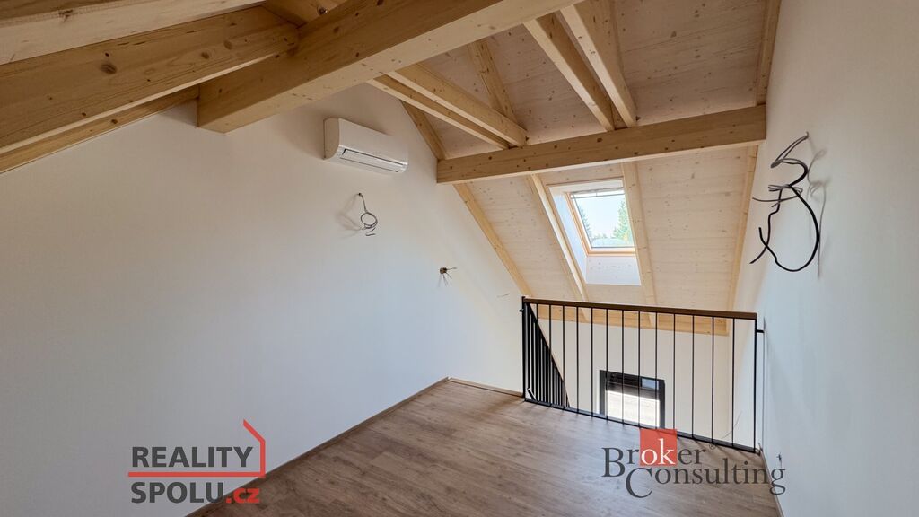 V patře jsou útulné ložnice, šatna a koupelna s technickým zázemím. Vybrané pokoje jsou řešeny jako mezonetové prostory, které dodávají interiéru vzdušnost a originální charakter.