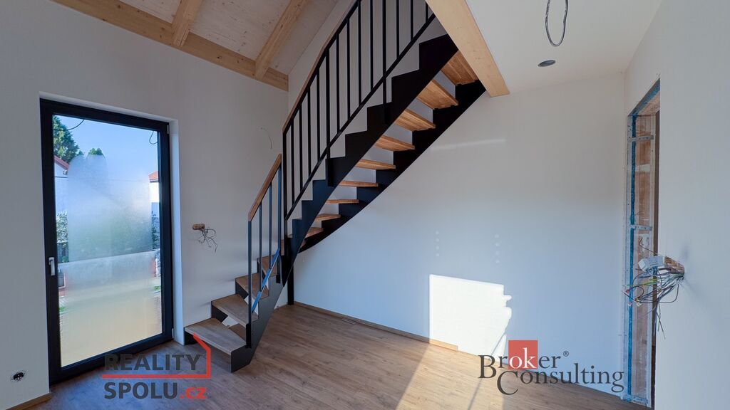 Interiér propojuje prostornost, světlo a moderní design. V přízemí se nachází vstupní hala, koupelna a velkorysý obývací pokoj s jídelnou a kuchyní, ze kterého je přímý vstup na terasu a do zahrady – ideální místo pro odpočinek a setkávání s blízkými.