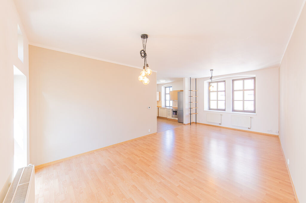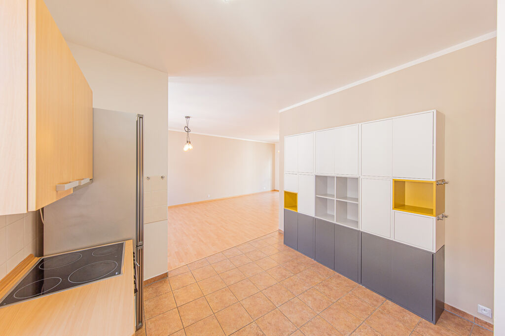 Dispozice bytu s výměrou 74 m2 je 2+kk. Doménou bytu je především velký obývací pokoj s kuchyní, ze kterého je krásný výhled na celou pěší zónu.