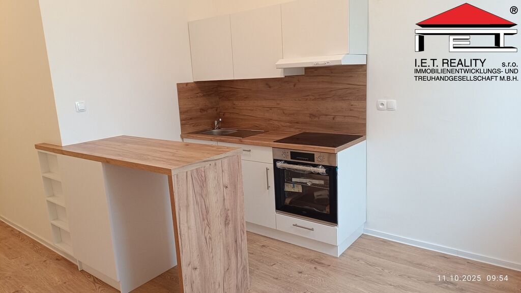 V bytě je moderní kuchyňská linka s el. varnou deskou, troubou a lednicí.