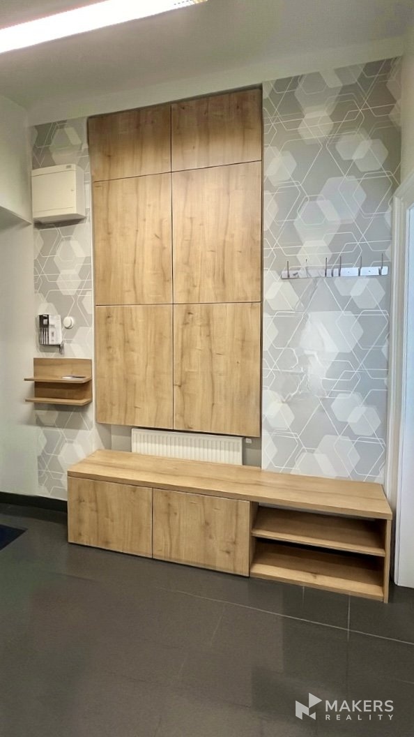 Byt se nachází ve 2. NP pětipodlažního domu. Při vstupu vás přivítá prostorná chodba, která poskytuje dostatek místa pro odkládání věcí. V obývací části je umístěna velká rohová pohovka, která nabízí dostatek místa pro relaxaci. Naproti pohovce je zavěšen televizor, vedle něj komoda na úložné věci. Interiér je laděn do světlých barev, což vytváří příjemnou atmosféru.