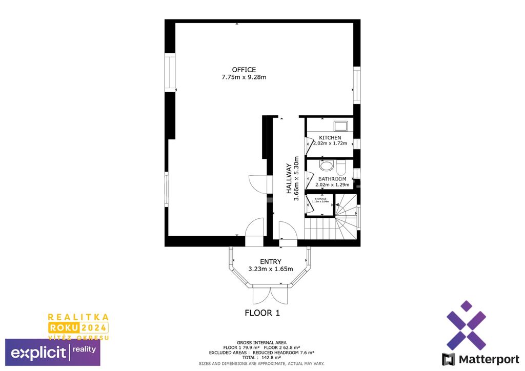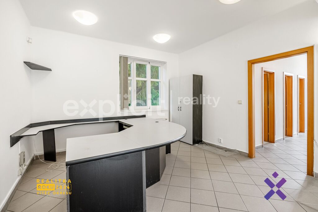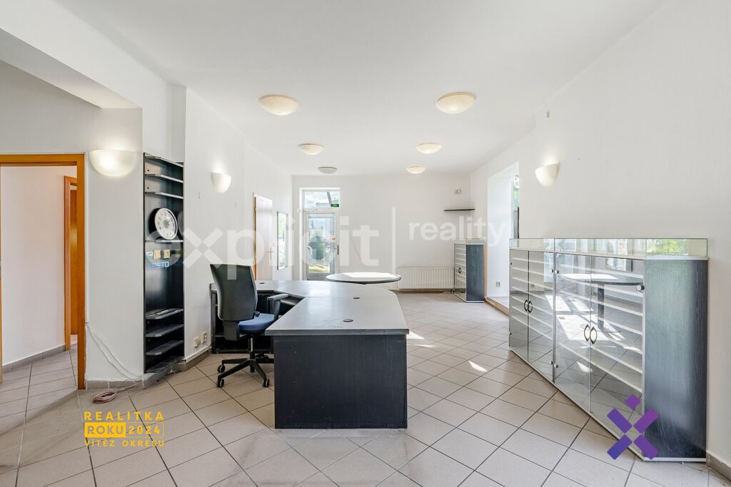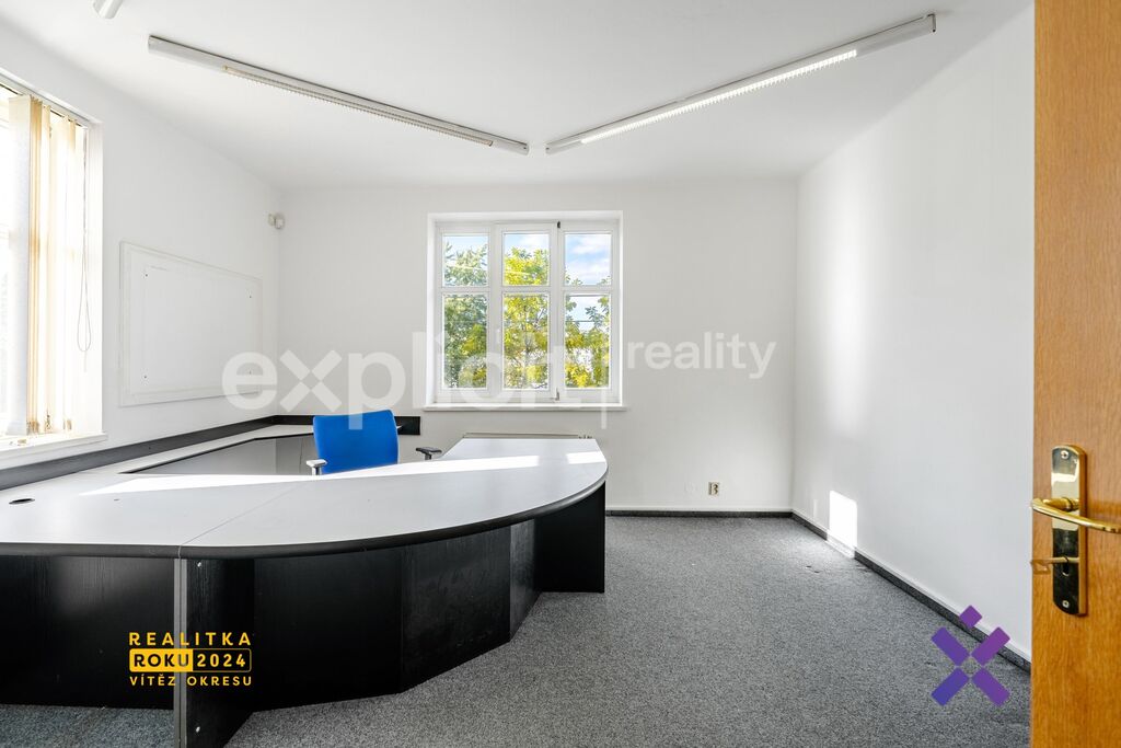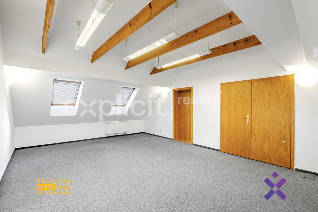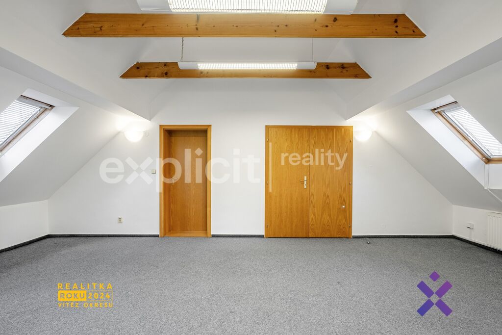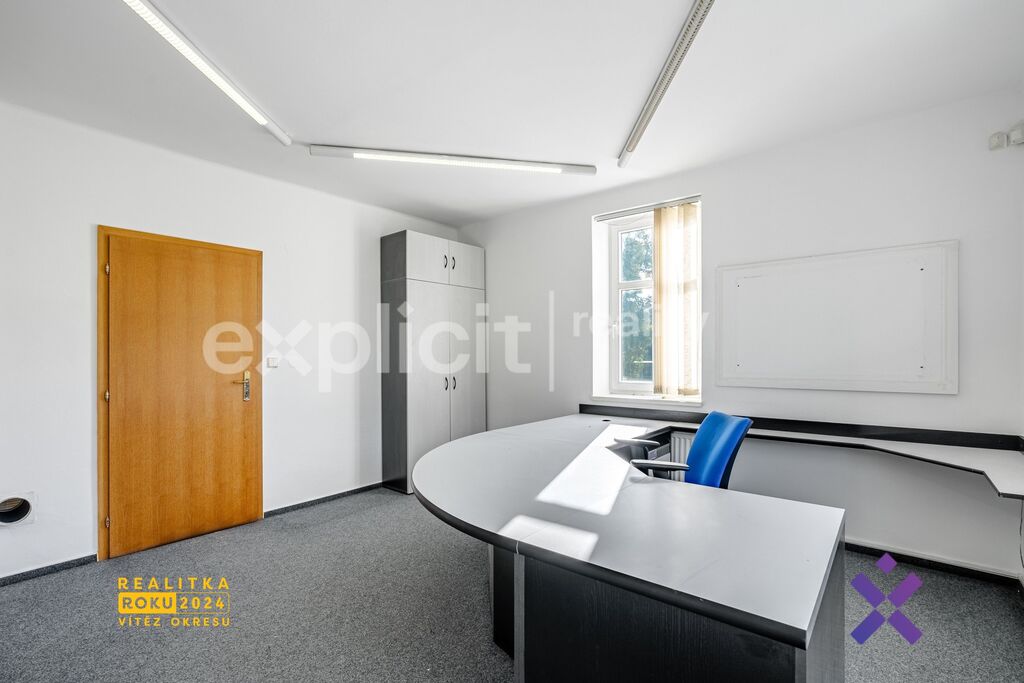 První patro nabízí kancelář a další velkou místnost, kterou můžete využít jako další kanceláře nebo školící prostory. Najdete zde také další kuchyňku a toaletu, což zajišťuje pohodlné zázemí pro administrativu, schůzky či školení.