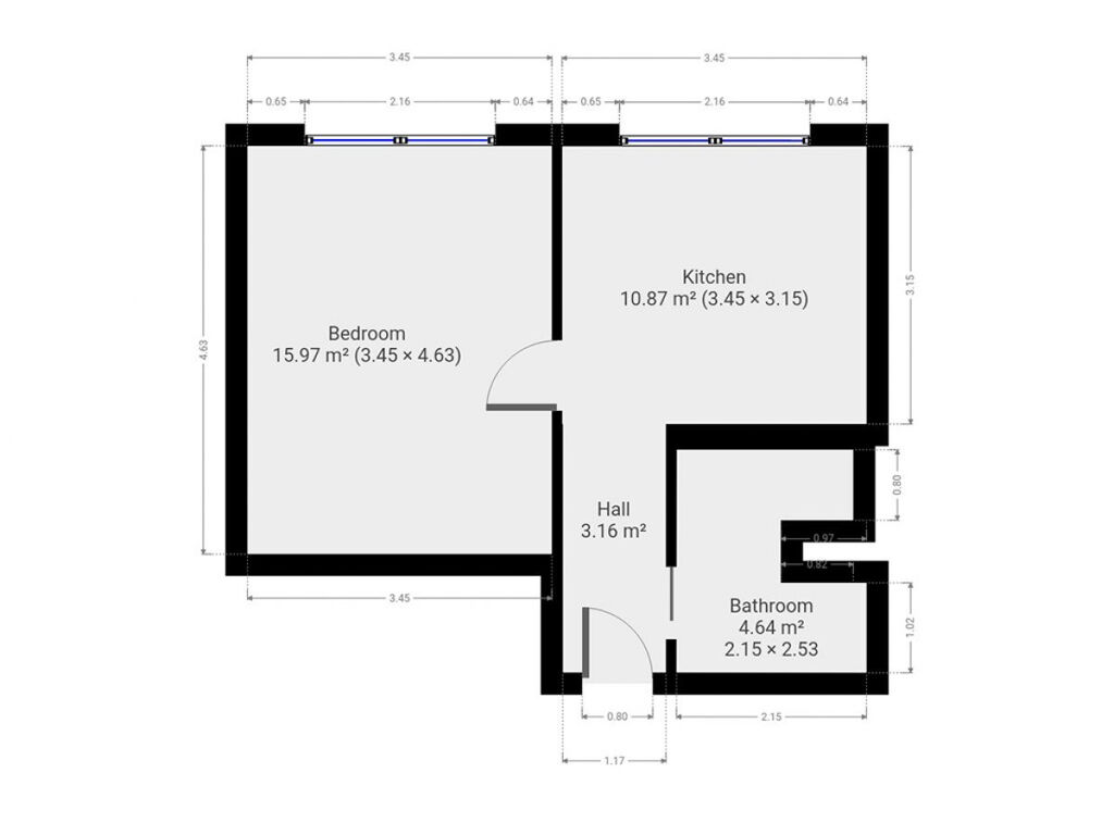 Byt se nabízí částečně vybaven - kuchyně disponuje troubou a digestoří. Zbytek místnosti je nevybaven. Druhá místnost je také bez vybavení. V koupelně je sprchový kout, umyvadlo, zrcadlo a toaleta.