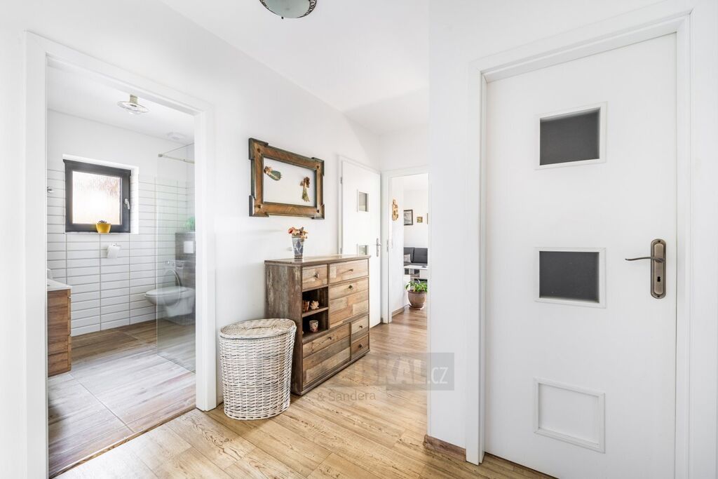 Dispozice domu je velmi praktická – z předsíně vstoupíte do chodby, odkud se dostanete do dvou samostatných pokojů, koupelny, šatny, samostatného WC a do prostorného obývacího pokoje s kuchyňským koutem a spíží. Obývací část je vybavena krbovými kamny, která dodávají nejen příjemné teplo, ale i útulnou atmosféru. Přímý vstup vede na zastřešenou terasu o ploše 19 m², odkud se otevírá hezký výhled do okolní krajiny. Část terasy je zasklená, součástí je i venkovní krb, plně vybavená letní kuchyně a také samostatná toaleta přístupná přímo z terasy, což oceníte při pobytu venku.