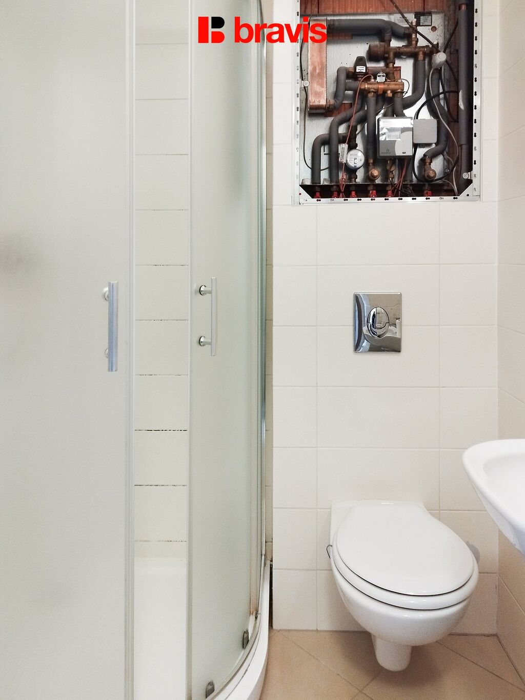Podlahy - plovoucí laminátová, dlažba. Okna - plastová se stínícími žaluziemi. Koupelna se sprchovým koutem, společná s toaletou, připojení na pračku. Vytápění - centrální zdroj (v bytě jsou radiátory, v koupelně otopný žebřík).