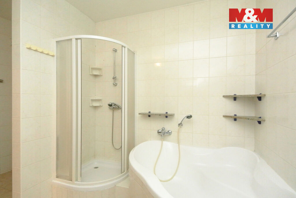 Druhá koupelna je vybavena vanou, sprchovým koutem a prostorem pro pračku a zároveň je vybavena také bidetem a toaletou.
