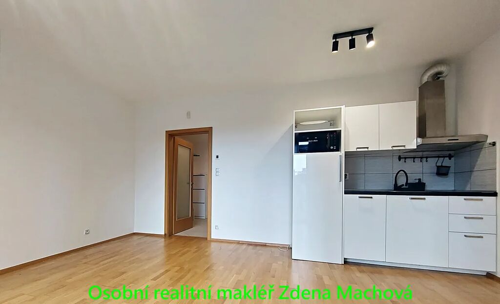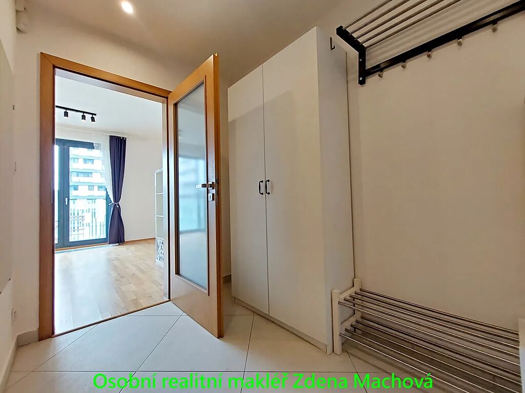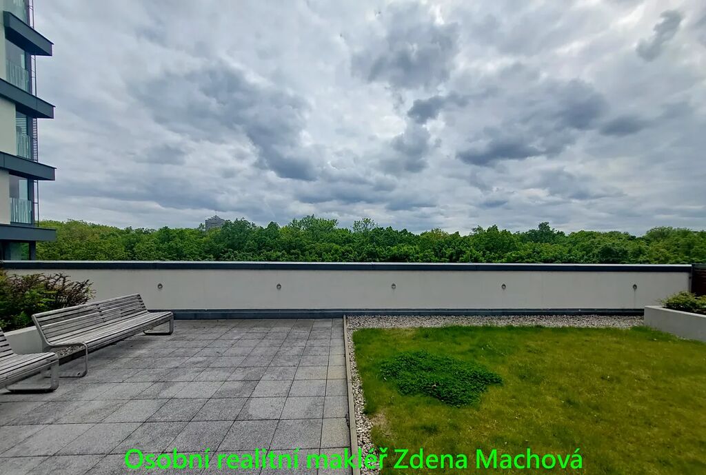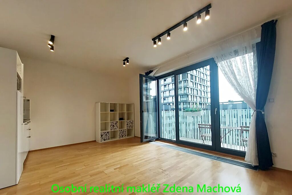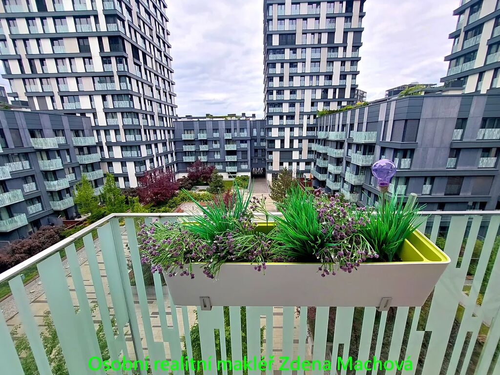 1KK s balkonem je o celkové ploše 40,7 m² (36 m² byt + 4,7 m² balkon) se nachází v 5. patře domu s výtahem. Dispozice bytu je praktická a maximálně využívá nabízený prostor. Obývací pokoj je propojen s kuchyňským koutem, kuch.linka se spotřebiči (lednice, myčka mikrovlnná trouba). Vchod na balkon se zahradním nábytkem, velkým francouzským oknem a výhled do klidného, upraveného vnitrobloku plného zeleně. Velká koupelna s vanou a skleněnou zástěnou, k dispozici i pračka. V předsíni šatní skříň a botník. Podlahová krytina dřevěná plovoucí a dlažba. Bezpečnostní vstupní dveře, francouzská okna s trojskly. K bytu a v ceně nájmu náleží sklep o velikosti 3,4 m², ideální pro uložení osobních věcí nebo sportovního vybavení.