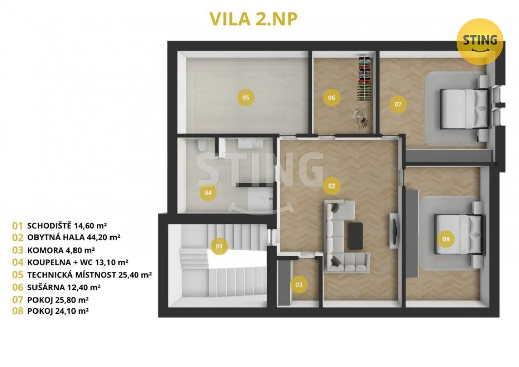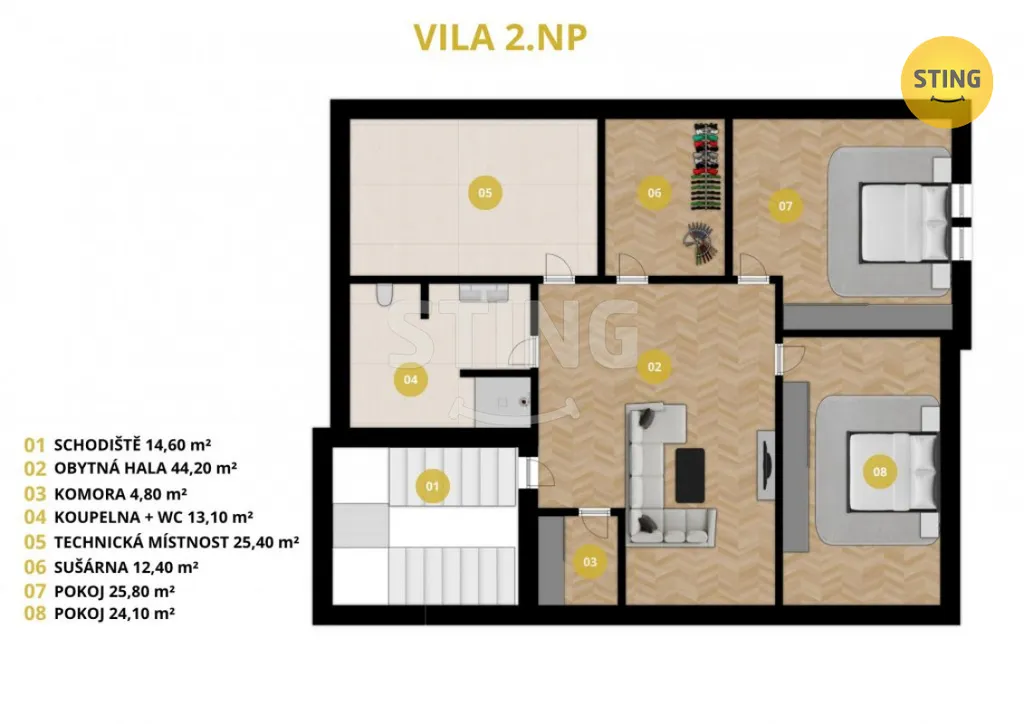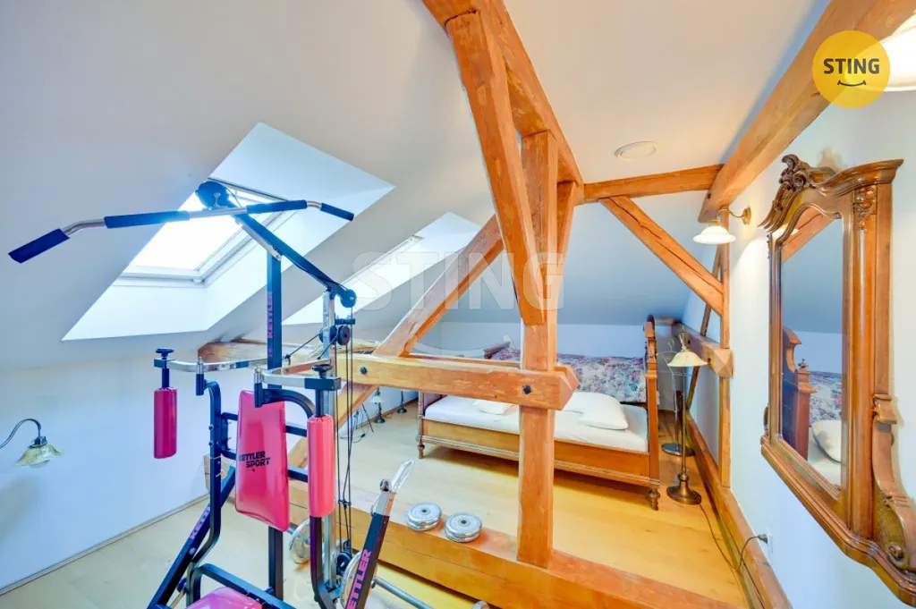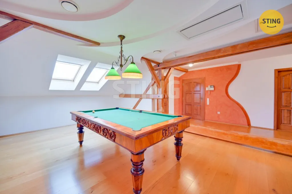 • Podkroví: centrální společenská místnost s kulečníkem, 3 další pokoje, technická místnost, šatna.