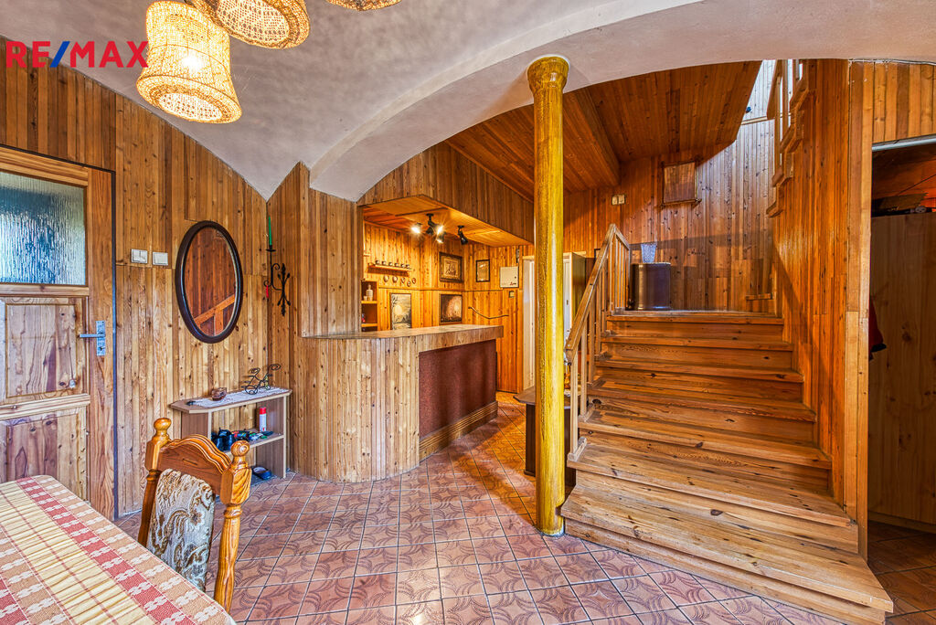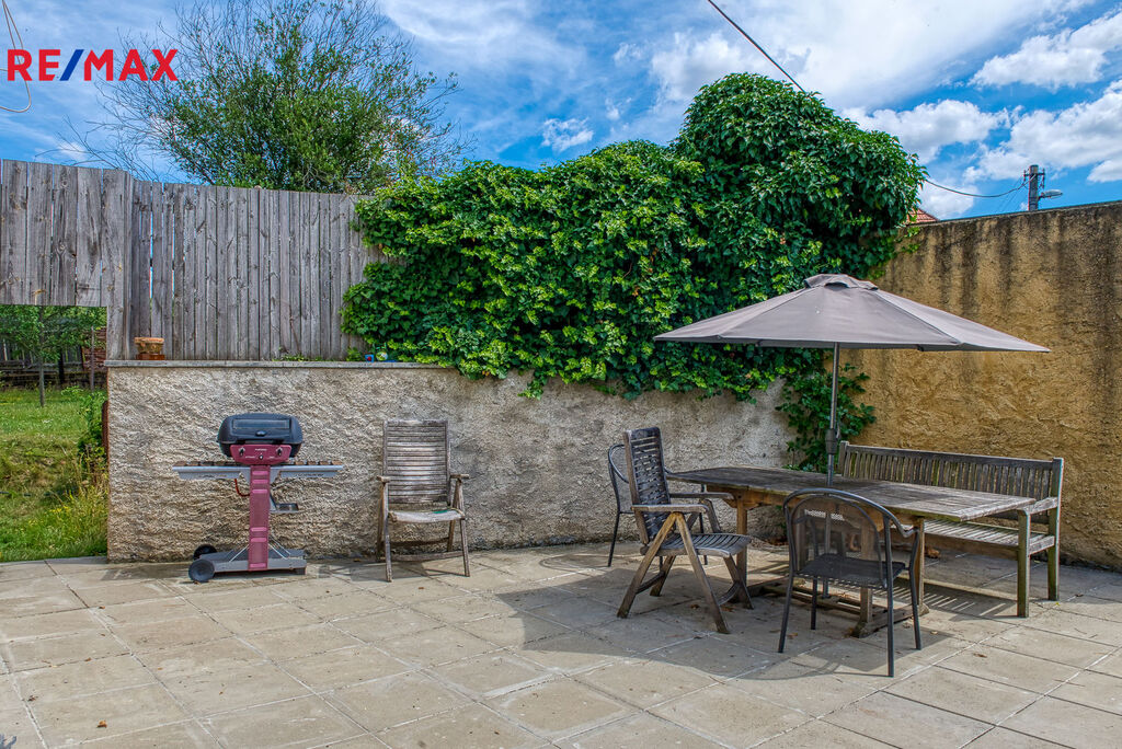 V 1.NP je společenská místnost s barem (11 m²), technická místnost a spíž. Z chodby se dá projít rovnou do garáže (21 m²) a k ní přilehlé kotelny. V zahradě je k dispozici venkovní sezení.