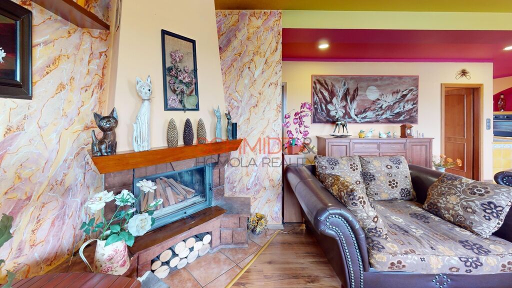 - 1NP má dispozici 4kk. Nabízí tři neprůchozí ložnice a velký obývací pokoj s kuchyňským koutem. V obývacím pokoji je krb s rozvodem tepla do všech místností v patře. I zde je z obývacího pokoje přístup na balkon s výhledem do okrasné zahrady a širšího okolí. V prvním podlaží je dále klimatizace, v koupelně podlahové vytápění.