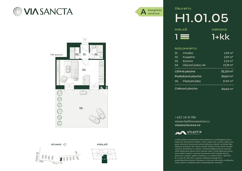 Dominantou tohoto bytu 1+kk o ploše 51,85 m² je velkorysá předzahrádka o rozloze 37,49 m² s krásným výhledem na golfové hřiště. Do zahrady vede přímý vstup z obytného prostoru s kuchyňským koutem, což vytváří příjemné propojení interiéru s exteriérem. Dispozici doplňuje chodba s úložným prostorem, komora a koupelna se sprchovým koutem. Praktické zázemí zajišťuje sklepní kóje a možnost garážového i venkovního parkování.
