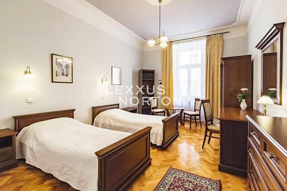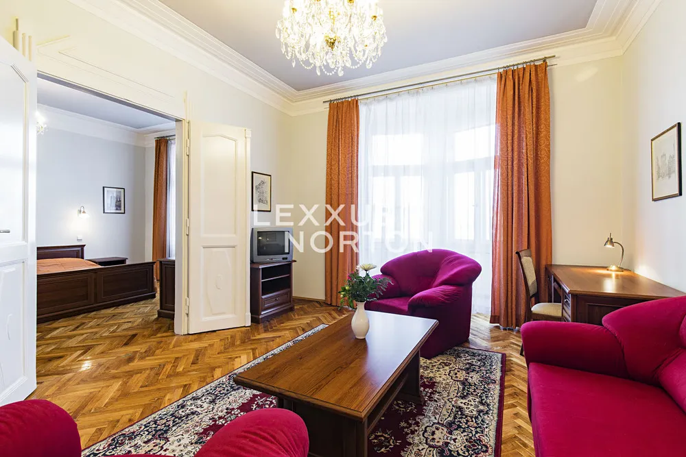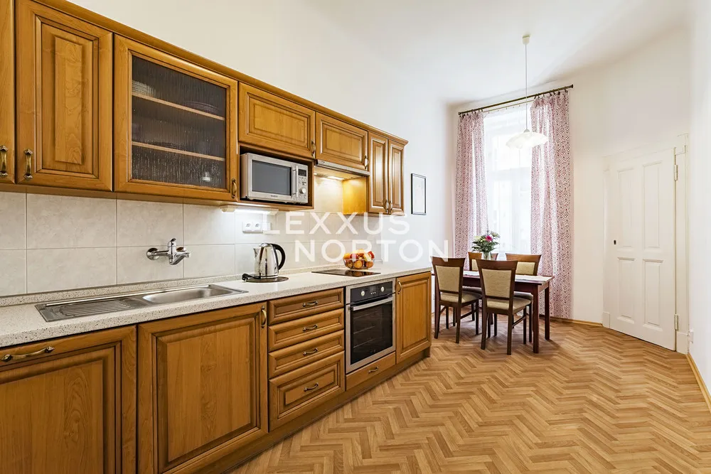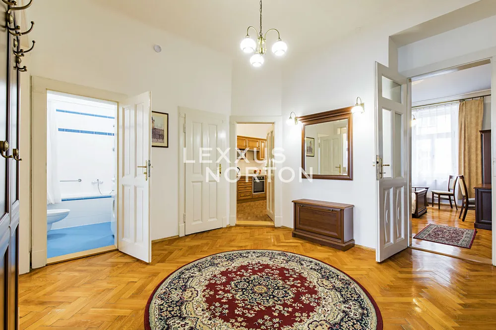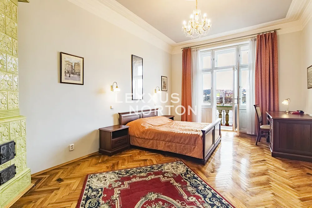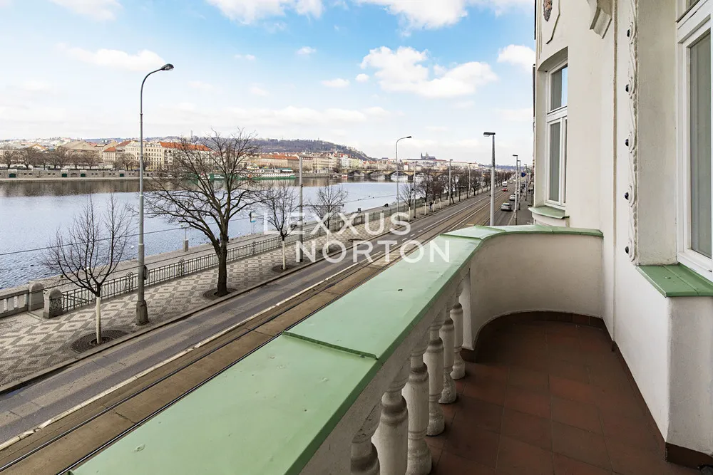 K pronájmu nabízíme byt o velikosti 100 m² s balkónem s výhledem na řeku Vltavu a Pražský hrad, situovaný v 1. patře secesního domu z roku 1913 v historickém centru Prahy na nábřeží řeky Vltavy s recepcí.