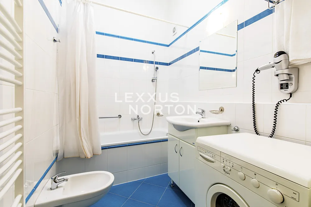 Interiér dispozičně tvoří vstupní hala, obývací pokoj s přímým vstupem na balkón, plně vybavená kuchyň, 2 ložnice, koupelnu (vana, toaleta a bidet), samostatnou toaletu a šatnu.