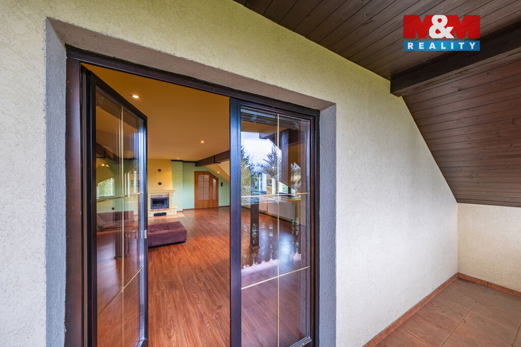velký obývací pokoj s krbem a balkonem, odkud je krásný výhled do zeleně.