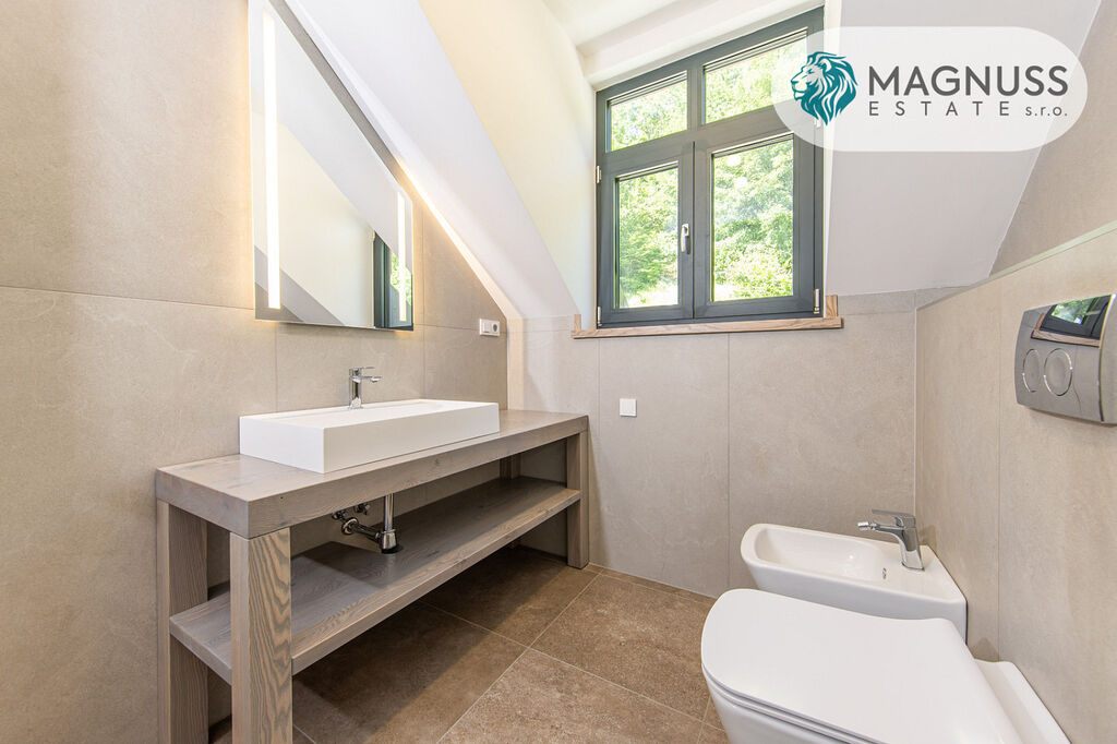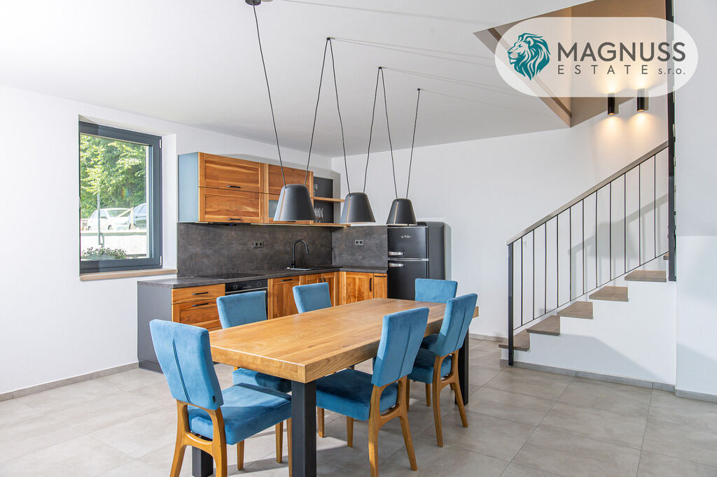 Dům je orientován na východ a navržen tak, aby komfortně sloužil dvěma samostatným apartmánům, každý o podlahové ploše 98 m², které mají společné zázemí v přízemí. V 1. nadzemním podlaží se nachází prostorná společenská místnost, sauna a technické zázemí. Celý prostor je proveden ve světlých tónech a přírodním stylu, který navazuje na okolní krajinu a působí velmi příjemně.