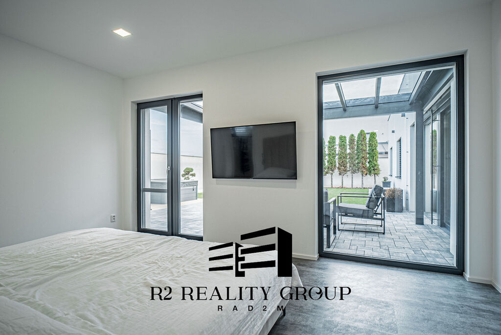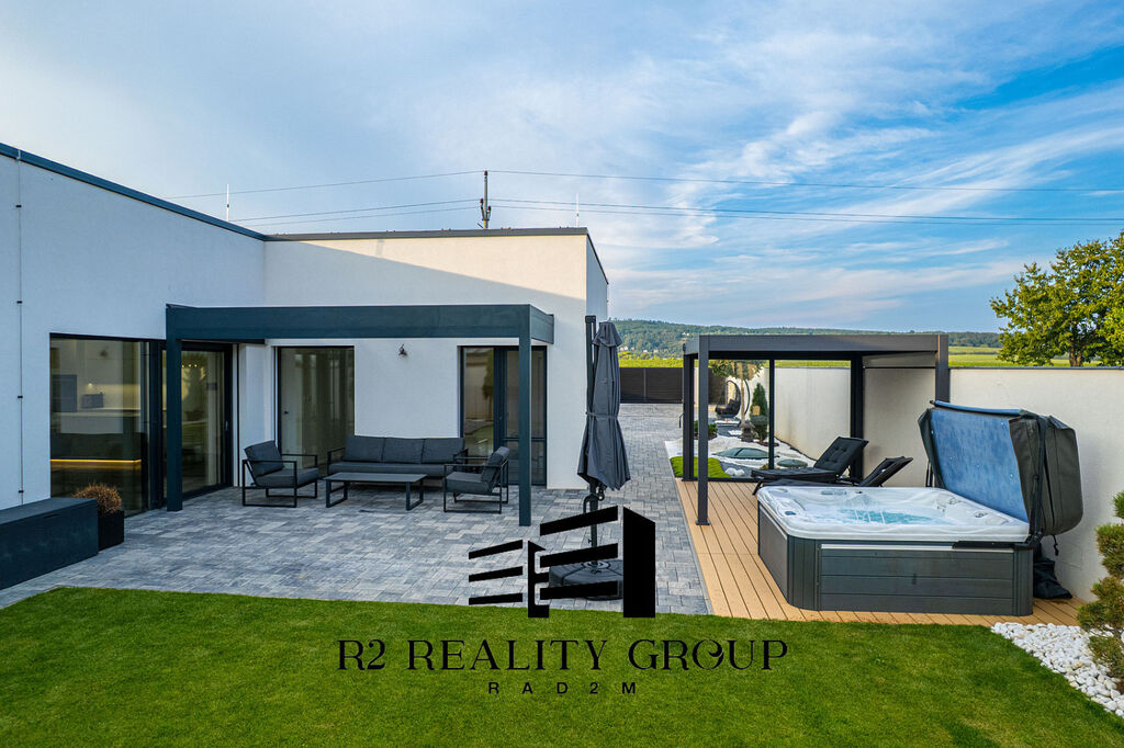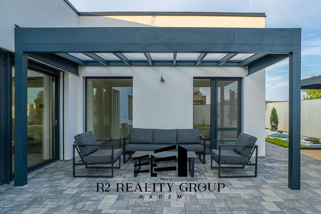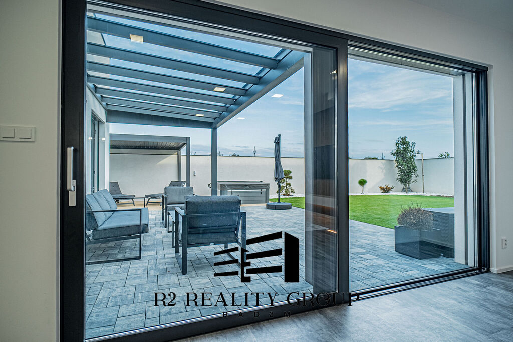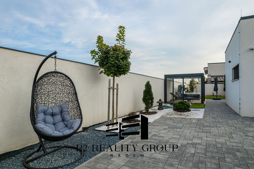 Na zahradě najdete dvě pergoly, první bioklimatickou a druhou prosklenou, která je přisazená k domu. Do WPC prken Woodplastic je zapuštěný vířivý bazén. K výbavě domu patří elektricky ovládané venkovní žaluzie. Dům je oplocen betonovým plotem a je monitorován alarmem a kamerami.