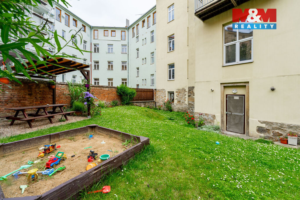 K bytu je k dispozici také společná zahrádka ve vnitrobloku, ideální pro odpočinek nebo posezení v klidném prostředí uprostřed města.