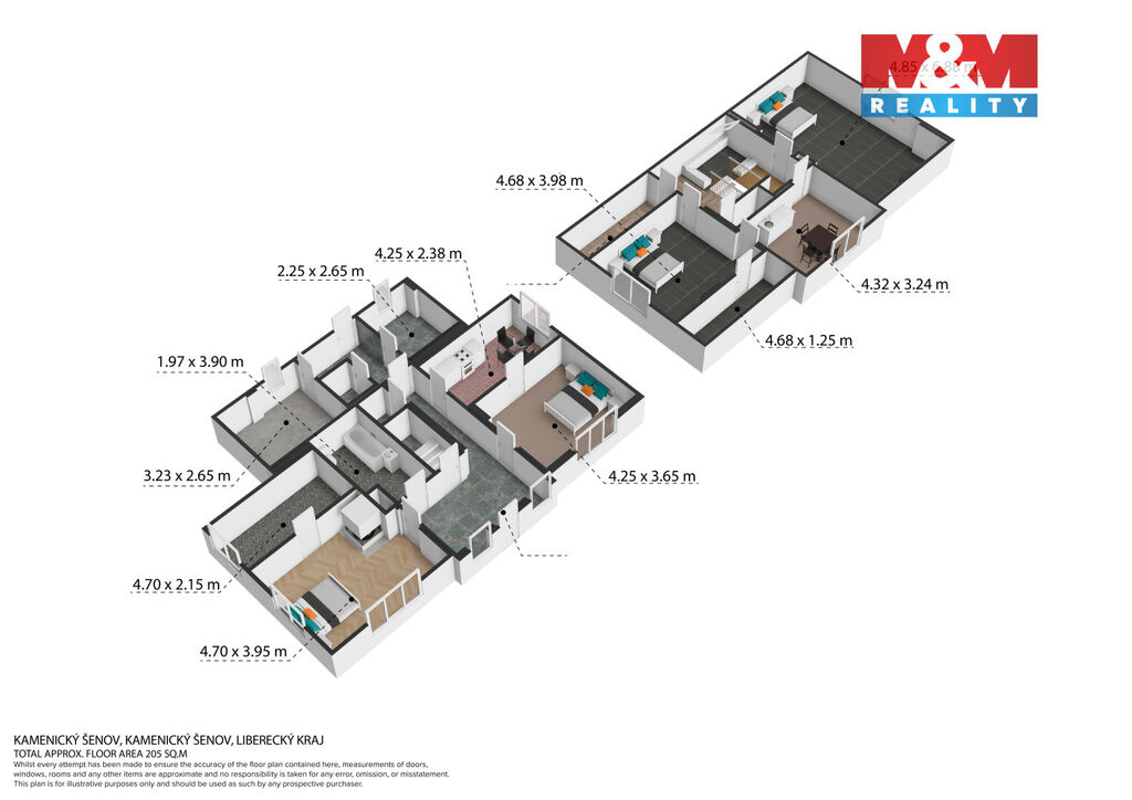 K dispozici je řada obytných místností. Ve spodní části se nachází tři + kuchyň a koupelna, zadní toaleta, a další úložné prostory a malá dílna. V horním patře jsou dvě místnosti + kuchyň, plus dva šatní prostory. Horní patro má ochoz, kde všechny místnosti jsou průchozí. Zahrada je ideální velikosti, nachází se zde skleník, pergola a velká garáž.