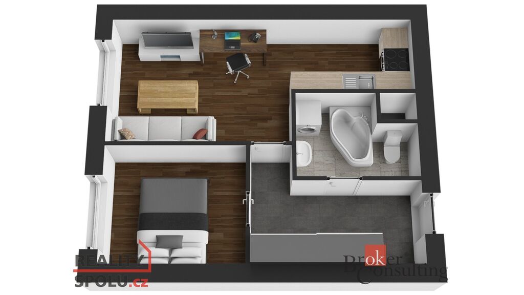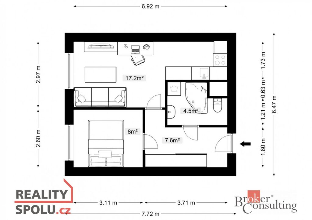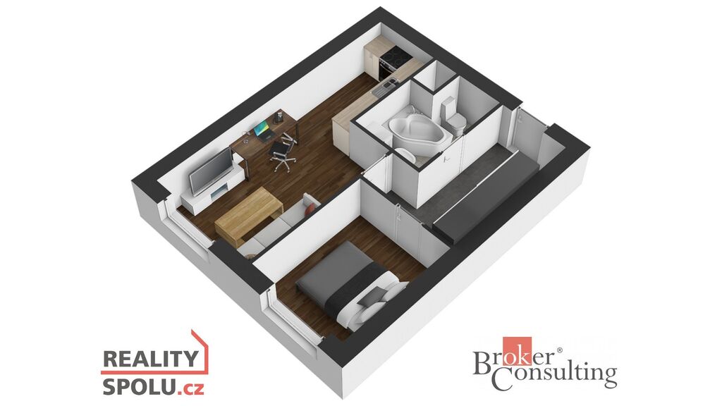 Byt se skládá z obývacího pokoje s kuchyňským koutem, ložnice, koupelny s vanou a toaletou a vstupní chodby.