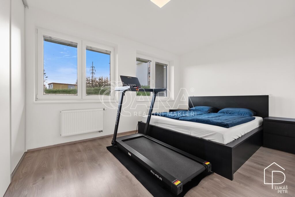 Orientace na východ znamená ranní světlo a byt, který se přes den nepřehřívá. Před okny je pás zeleně, kde můžete v klidu posedět – formálně obecní pozemek, ale běžně využívaný obyvateli domu.
