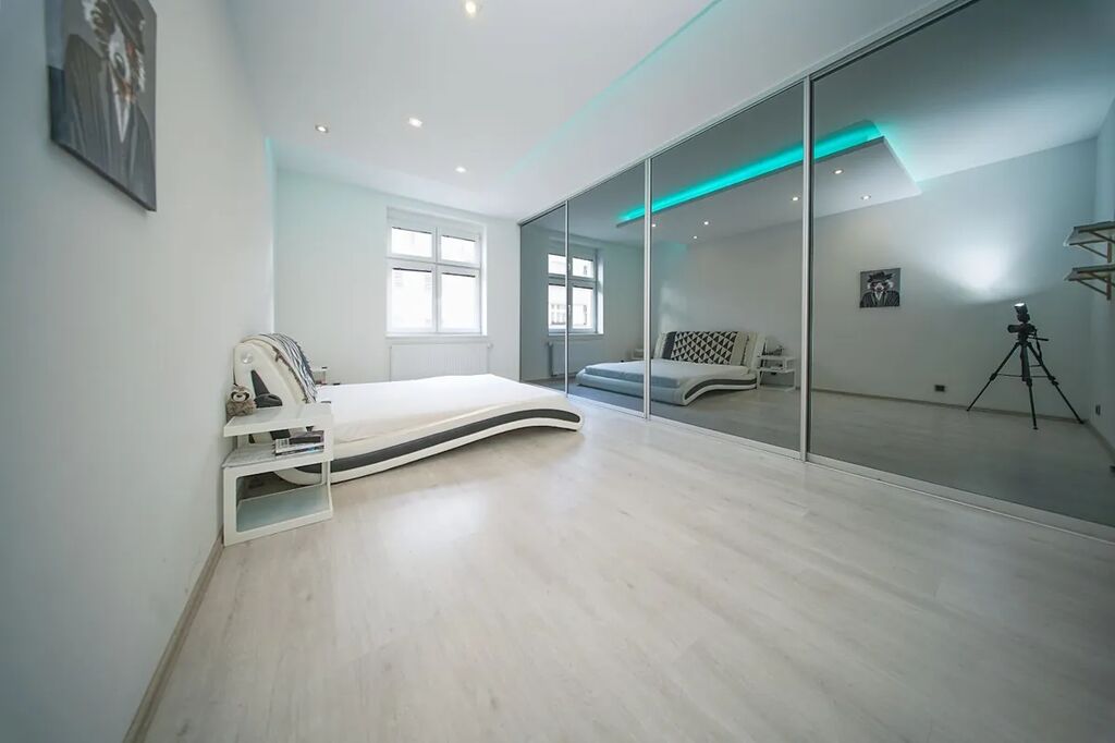 Vysoké stropy (284 cm) se sádrokartonovými podhledy s bodovým osvětlením a s dálkově ovládaným barevným led podsvícením.