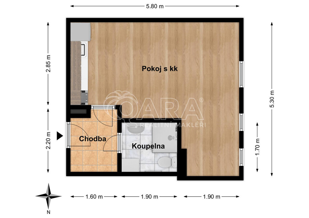 Dispozice do tvaru L zajišťuje příjemně členěný prostor – velkorysý obývací pokoj s kuchyňským koutem a oddělenou část pro spaní s výhledem do zeleně.