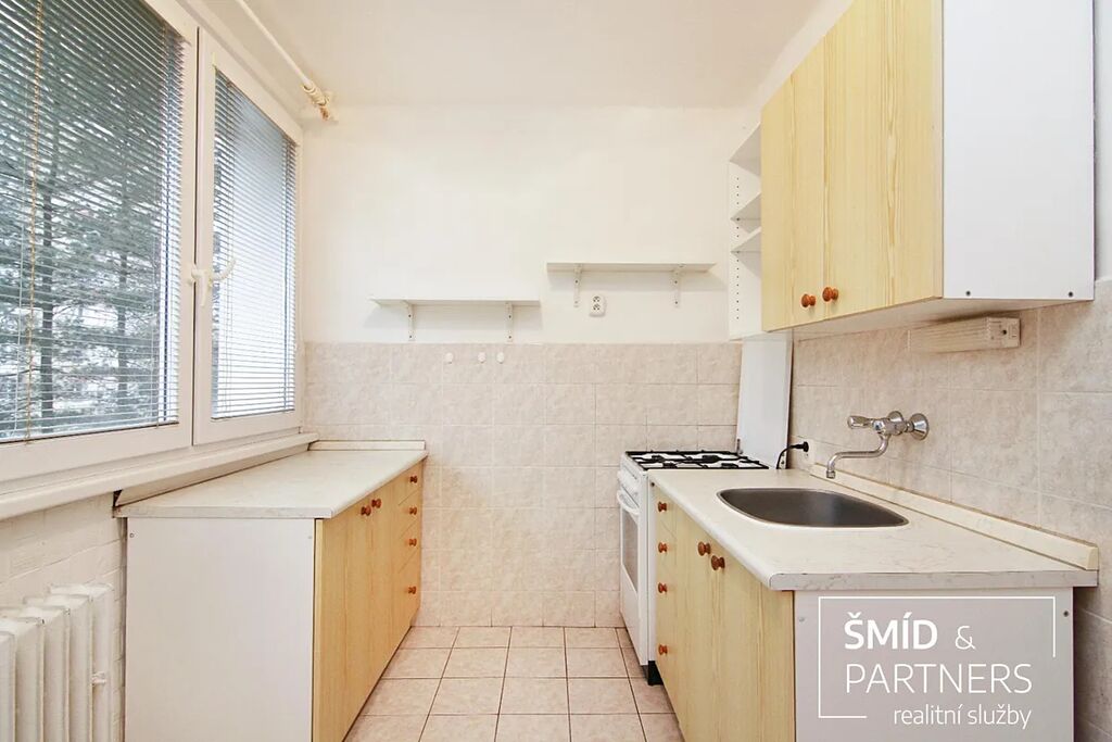 Byt je vybaven kuchyňskou linkou s plynovým sporákem a el. troubou. V předsíni je prostorná vestavěná skříň a dále je odtud vstup do samostané koupelny, toalety a obývacího pokoje.