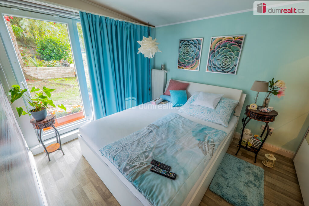 Z ložnice vede francouzské okno s přímým vstupem na přední část zahrady, která nabízí dostatek prostoru pro odpočinek u bazénu.