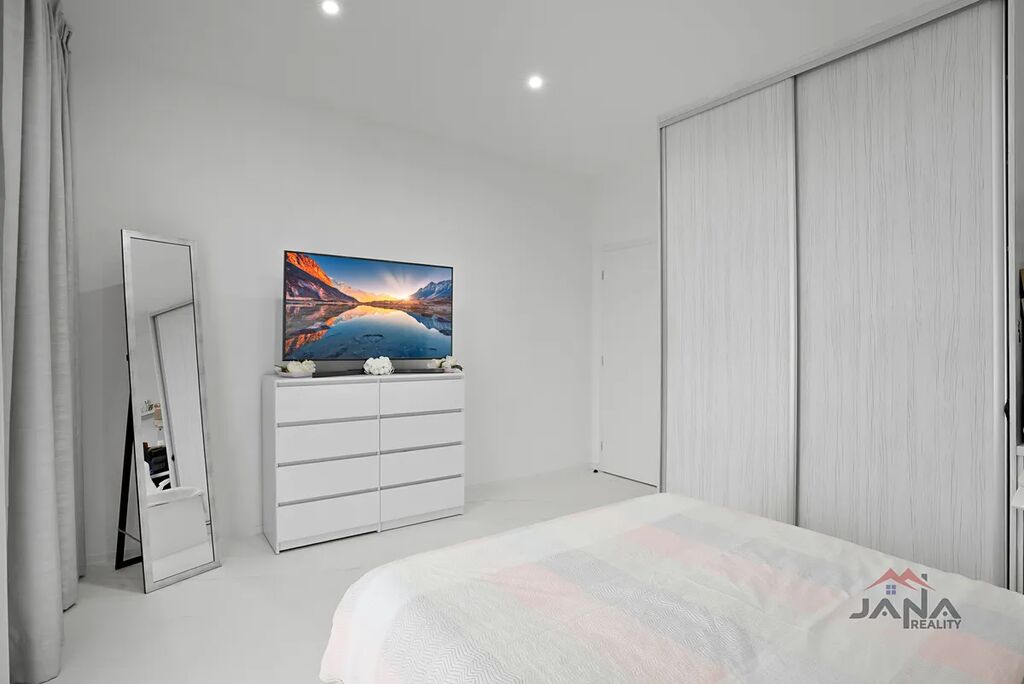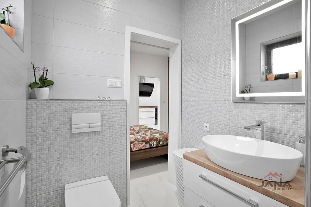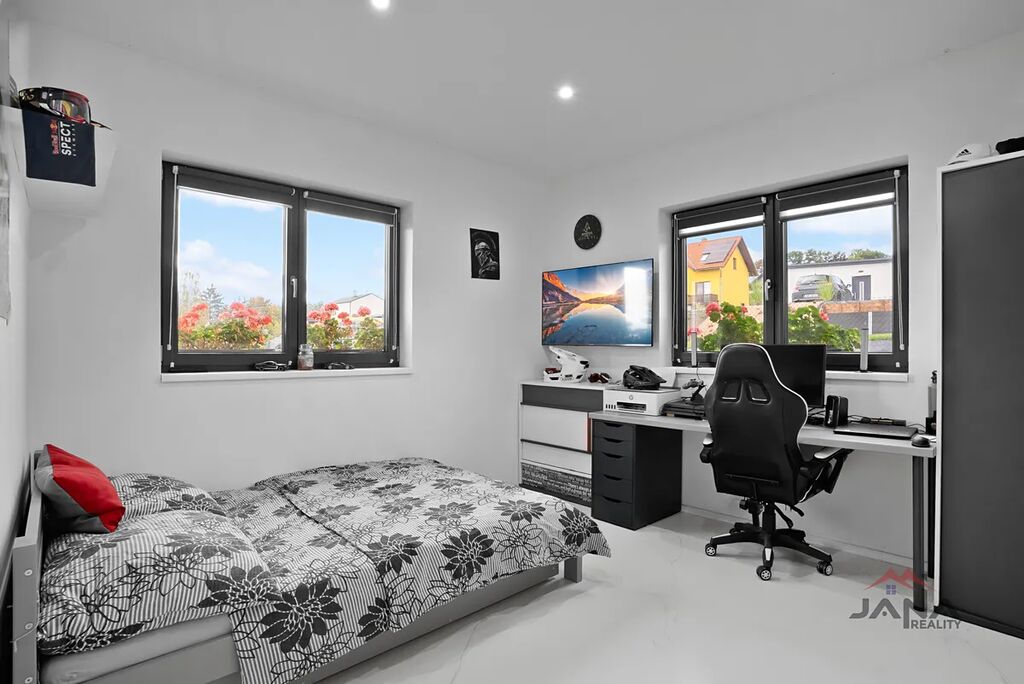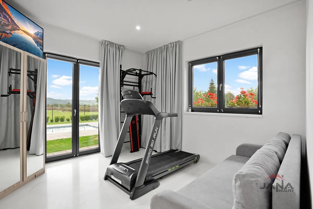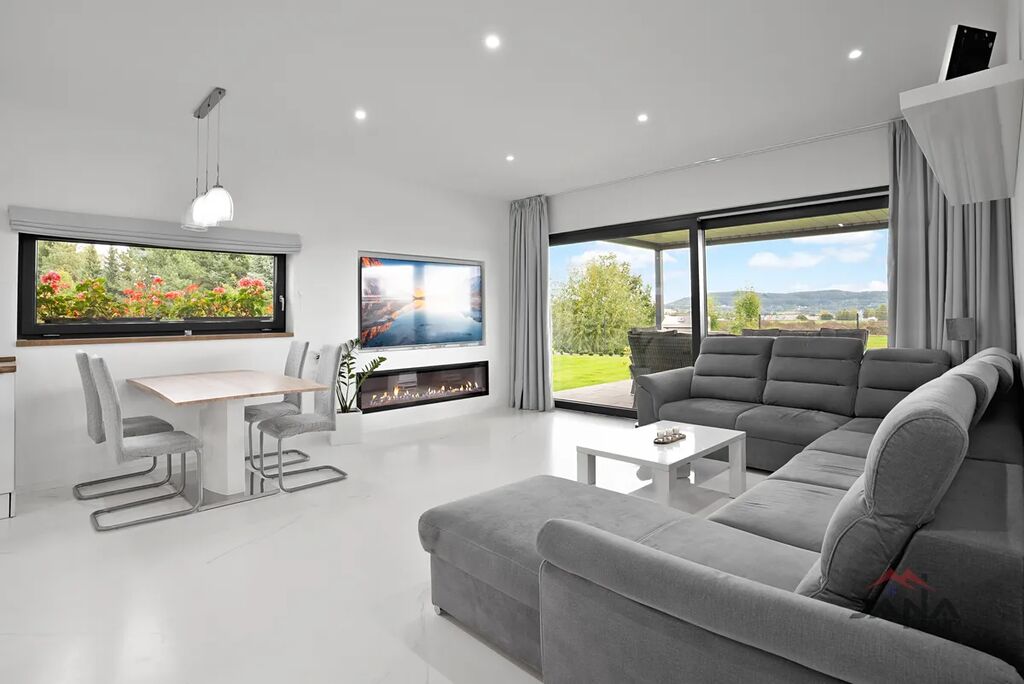 Dům je postaven s důrazem na nízké provozní náklady a maximální komfort. Efektivní vytápění zajišťuje tepelné čerpadlo v kombinaci s podlahovým topením, které zároveň zajišťuje ohřev TUV. Pro ještě větší úspory je systém doplněn solárními kolektory na ohřev TUV. V celém domě jsou plastová okna s trojskly, podlahy z lité epoxidové pryskyřice s mramorovým dekorem a strop je osazen bodovým LED osvětlením. Obývacímu pokoji dominuje pět metrů široký posuvný portál HS (polovina otevíratelná), který plynule propojuje interiér s terasou a zahradou. Moderní kuchyňská linka v bílém vysokém lesku je vybavena vestavěnými spotřebiči značky Philco – troubou, indukční deskou, mikrovlnnou troubou, lednicí, myčkou a vinotékou. Pracovní deska i parapety jsou v dekoru Dub Hunton. Obývací pokoj je vybaven vestavěnou TV a elektrickým krbem, které jsou součástí prodeje.