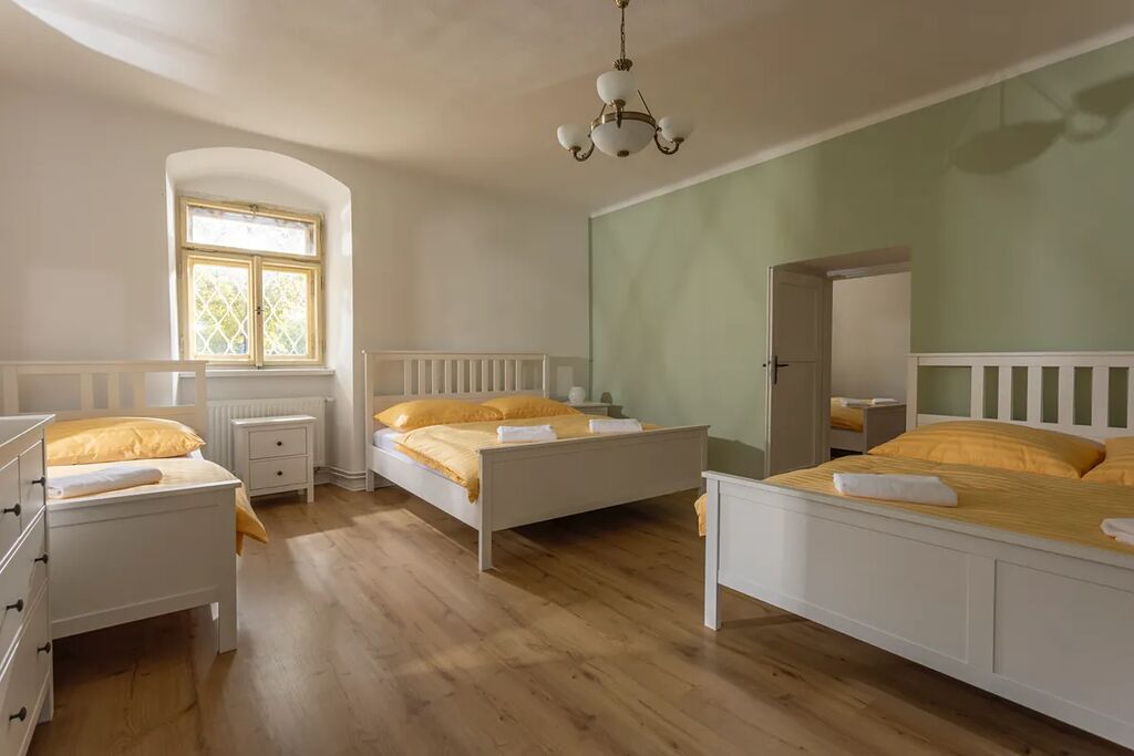 Jeho dispozice je velice prostorných 6 plus 1. V každém patře naleznete koupelnu společnou s toaletou a v patře plně vybavenou kuchyň.