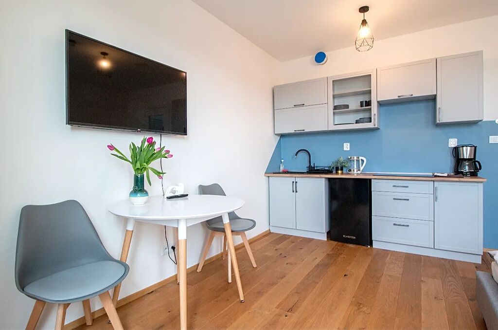 Byt je zařízený. Kuchyň je vybavená kuchyňskou linkou a elektrospotřebiči.
