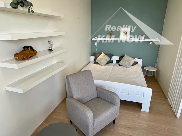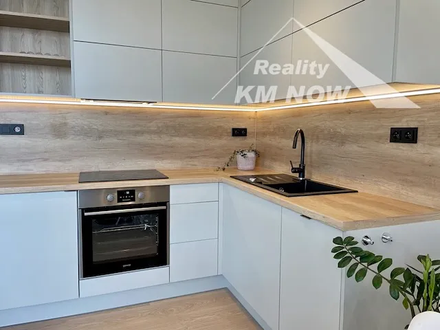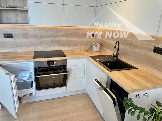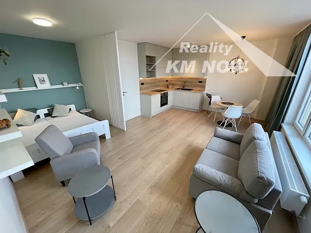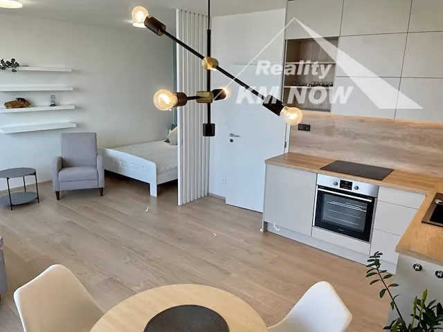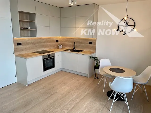 Nabízíme k pronájmu kompletně zařízený nadstandardní byt 1+kk o výměře 48 m2 s terasou, umístěný v 5. podlaží novostavby bytového domu v Kroměříži. Byt disponuje obývacím pokojem s kompletně vybavenou kuchyňskou linkou a přímým vstupem na prostornou terasu. Nová kuchyňská linka je plně vybavena vestavnými spotřebiči (horkovzdušná trouba, el. varná deska, digestoř, myčka nádobí, lednice s menším mrazákem). Ložnice je designově oddělena od obývací části. Koupelna vybavena sprchovým koutem a prostorem pro umístění pračky a sušičky. Samostatné WC. Součástí bytu je prostorná šatna. V bytě jsou bezpečnostní vstupní dveře. Forma vytápění a ohřevu vody za pomocí centrální kotelny v domě. K bytu náleží zděný sklep. V domě je výtah. Pro více informací a prohlídku neváhejte kontaktovat makléře. K dispozici od 15.10.2025.