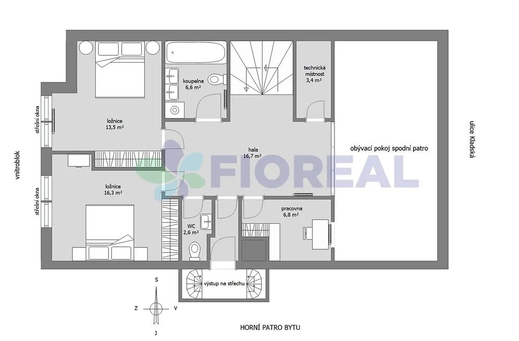 Mezonetový byt o dispozici 5+1 a podlahové ploše 163 m² se nachází v šestém patře domu v Kladské ulici na Praze 2. Dispozičně se jedná o spodní společenské patro s obývacím pokojem a oddělenou kuchyní, pracovnou/dětským pokojem/pokojem pro hosty se samostatnou koupelnou, vstupní halou a samostatnou toaletou. Ke kuchyni náleží balkón orientovaný na západ do vnitrobloku o velikosti 9,05 m² na kterém můžete snídat, zatímco druhý balkón o velikosti 13,15 m² orientovaný na východ navazuje obývací pokoj. Díky posuvným dveřím se oba venkovní prostory mohou propojit s vnitřním prostorem a využívat od rána až do večera. Celé podlaží se dá kompletně otevřít a získat tak volný prostor mezi obývacím pokojem, vstupní halou a kuchyní, viz. dispoziční plánek ve fotogalerii. Kuchyňská linka obsahuje všechny spotřebiče (myčka, varná deska, digestoř, vestavná lednice a mrazící box, trouba a mikrovlnná trouba) a na obou patrech je v každé místnosti klimatizace. Na podlahách bytu jsou parkety, v kuchyni, koupelnách, toaletách a technických místnostech je dlažba.