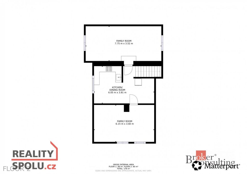 V přízemí se nachází vstupní chodba, dvě koupelny se sprchovým koutem a WC, kuchyň s jídelním koutem, obývací pokoj a ložnice. Ve 2. nadzemním podlaží je menší chodba, další ložnice, kuchyň a obývací pokoj. Dům je částečně podsklepený.