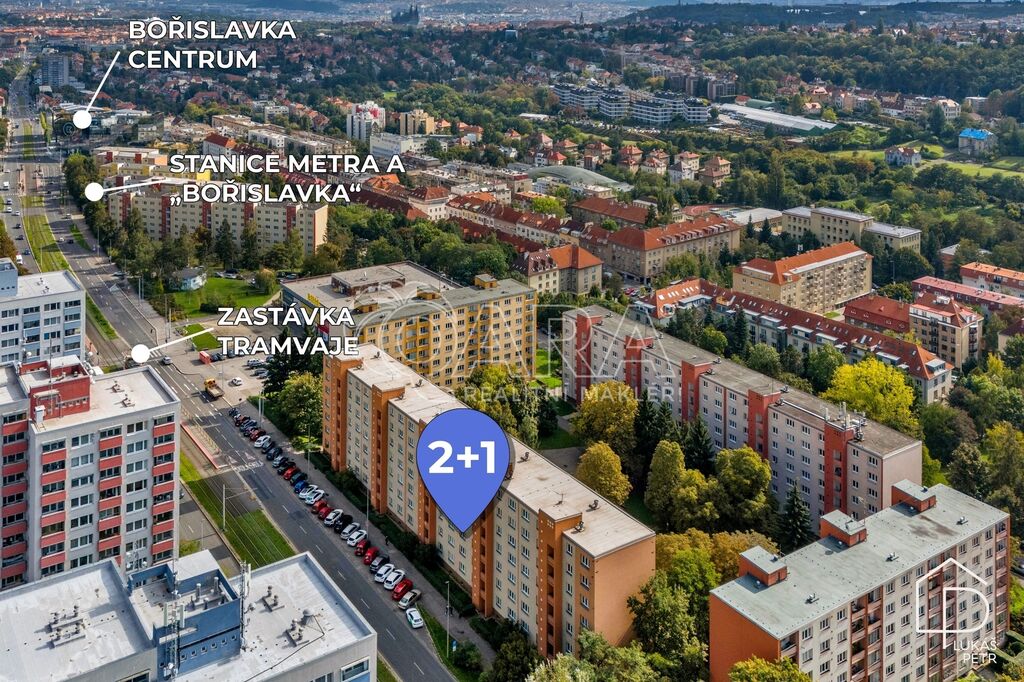 Tramvajová zastávka je přímo u domu, stanice metra Bořislavka přibližně pět minut chůze.